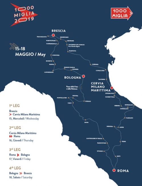 Il tradizionale percorso, da Brescia a Roma e ritorno in quattro giorni, 1801 chilometri, si articolerà come sempre in 4 tappe con 112 prove cronometrate e 7 prove di media oraria. La prima tappa da Brescia a Cervia-Milano Marittima, mercoledì 15 maggio, comincerà alle 14.30 dalla pedana di Viale Venezia. Lungo il percorso la carovana attraverserà Desenzano e Sirmione del Garda, entrerà nel suggestivo Parco Giardino Sigurtà e, passando per Mantova, Ferrara e Comacchio, si dirigerà a Ravenna per concludere la prima giornata di gara. La seconda tappa da Cervia-Milano Marittima a Roma, giovedì 16 maggio prenderà il via di prima mattina in direzione Roma. Passando per Cesenatico, Gambettola, Urbino, Corinaldo, Senigallia e Fabriano. In seguito l’Umbria, con Assisi, Perugia e Terni, per poi entrare nel Lazio, passare per Rieti e raggiungere la Capitale alle luci del tramonto. La terza tappa da Roma a Bologna, venerdì 17 maggio, sarà una lunga tappa di risalita che attraverserà: Viterbo, Radicofani, Castiglione d’Orcia e Siena fino ad arrivare a una delle novità di quest’anno: Vinci, città natale di Leonardo, in occasione dei 500 anni dalla morte dell’artista. Il percorso proseguirà verso Montecatini e Pistoia, attraverserà il centro storico di Firenze e, passando attraverso il Passo della Futa e della Raticosa, giungerà a Bologna, città sede dell’ultima notte di gara. Quarta ed ultima tappa, da Bologna a Brescia, sabato 18 maggio, prevedrà il passaggio per Modena, Reggio Emilia, Langhirano e Parma. In seguito le auto in gara faranno rotta su Busseto, Cremona e Carpenedolo. Il tratto finale della gara vedrà i passaggi da Montichiari e Travagliato, prima di tagliare il traguardo sulla pedana di Viale Venezia e dare il via ai festeggiamenti.