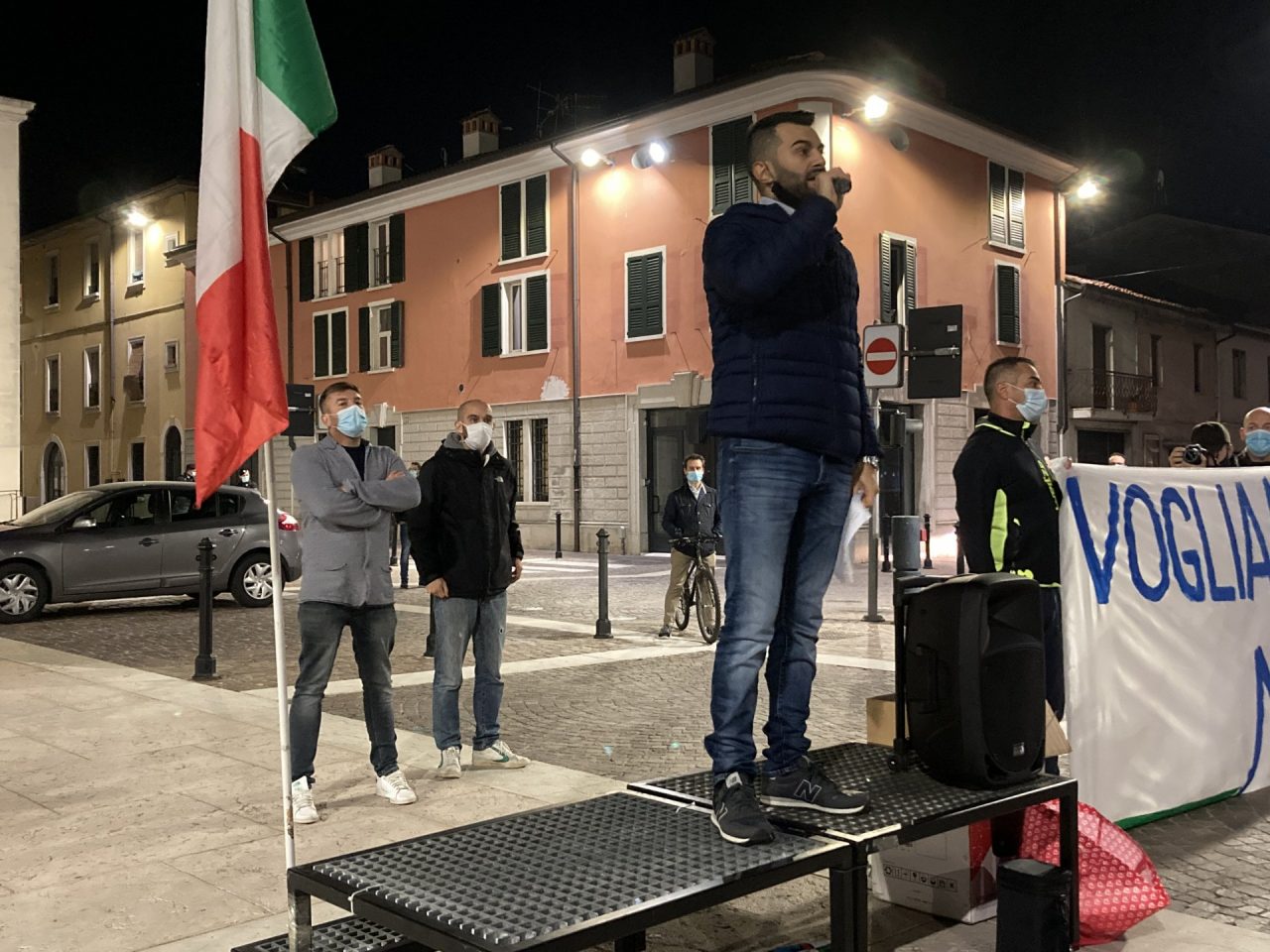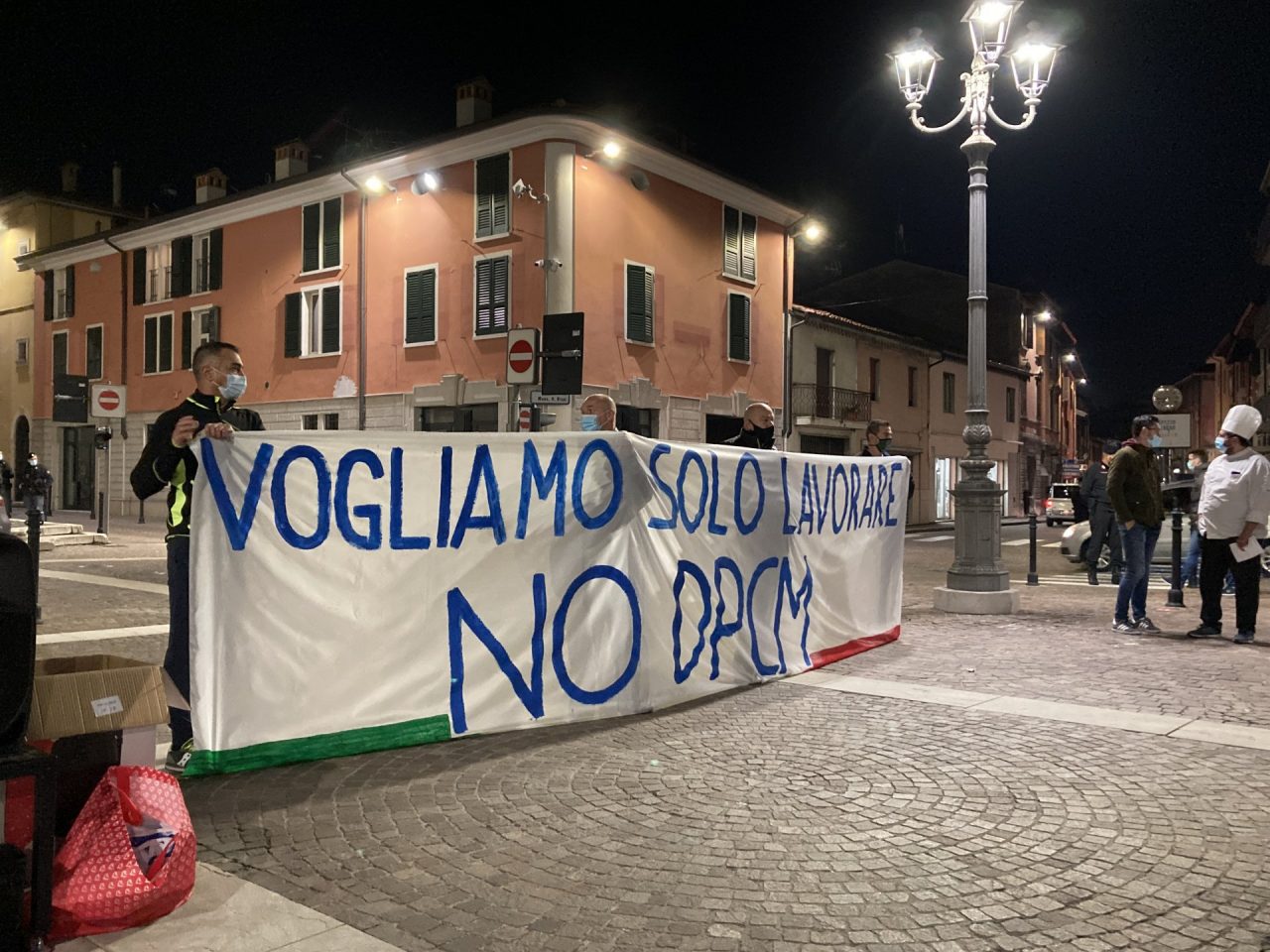 Oltre cento persone stasera sono scese in piazza Roma, a Ospitaletto, per manifestare contro l’ultimo DPCM che impone la chiusura anticipata alle 18 di ristoranti e locali, lo stop delle attività sportive e culturali e il coprifuoco alle 23.