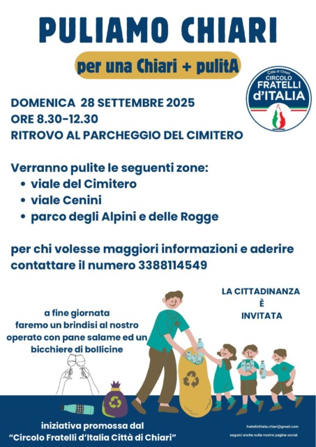 Domenica 28 settembre 2025 il Circolo Fratelli d’Italia Città di Chiari organizza una mattinata all’insegna della cura dell’ambiente e del senso civico. L’iniziativa, dal titolo “Puliamo Chiari”, punta a restituire decoro ad alcune aree della città e a sensibilizzare la cittadinanza sull’importanza del rispetto degli spazi comuni.