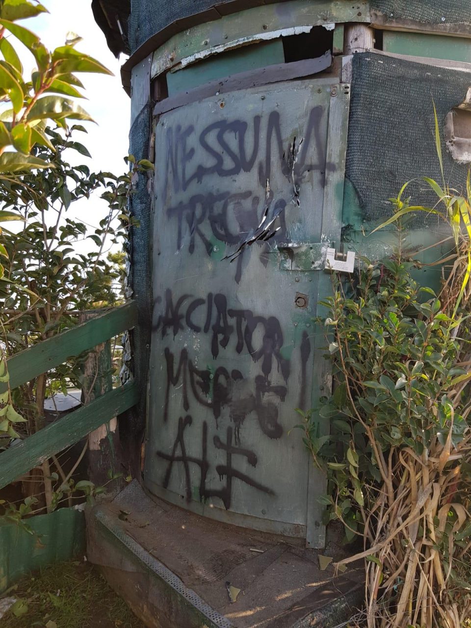 “Cacciatori assassini”, e ancora “Nessuna tregua, m*rde”. Le scritte che questa mattina sono state trovate sul Montorfano, in zona Cologne. Tutto intorno reti tagliate, assi rotte e capanni dei caccia completamente distrutti. E’ il raid vandalico andato in scena nella notte sul Montorfano: a rivendicare l’atto Alf, il Fronte liberazioni animali, che ha colpito una dozzina di capanni tra Cologne, Erbusco e Coccaglio, liberando anche tutti gli animali da richiamo che erano custoditi nelle strutture. Non è la prima volta: snche negli anni scorsi gli stessi capanni erano stati colpiti dagli animalisti.