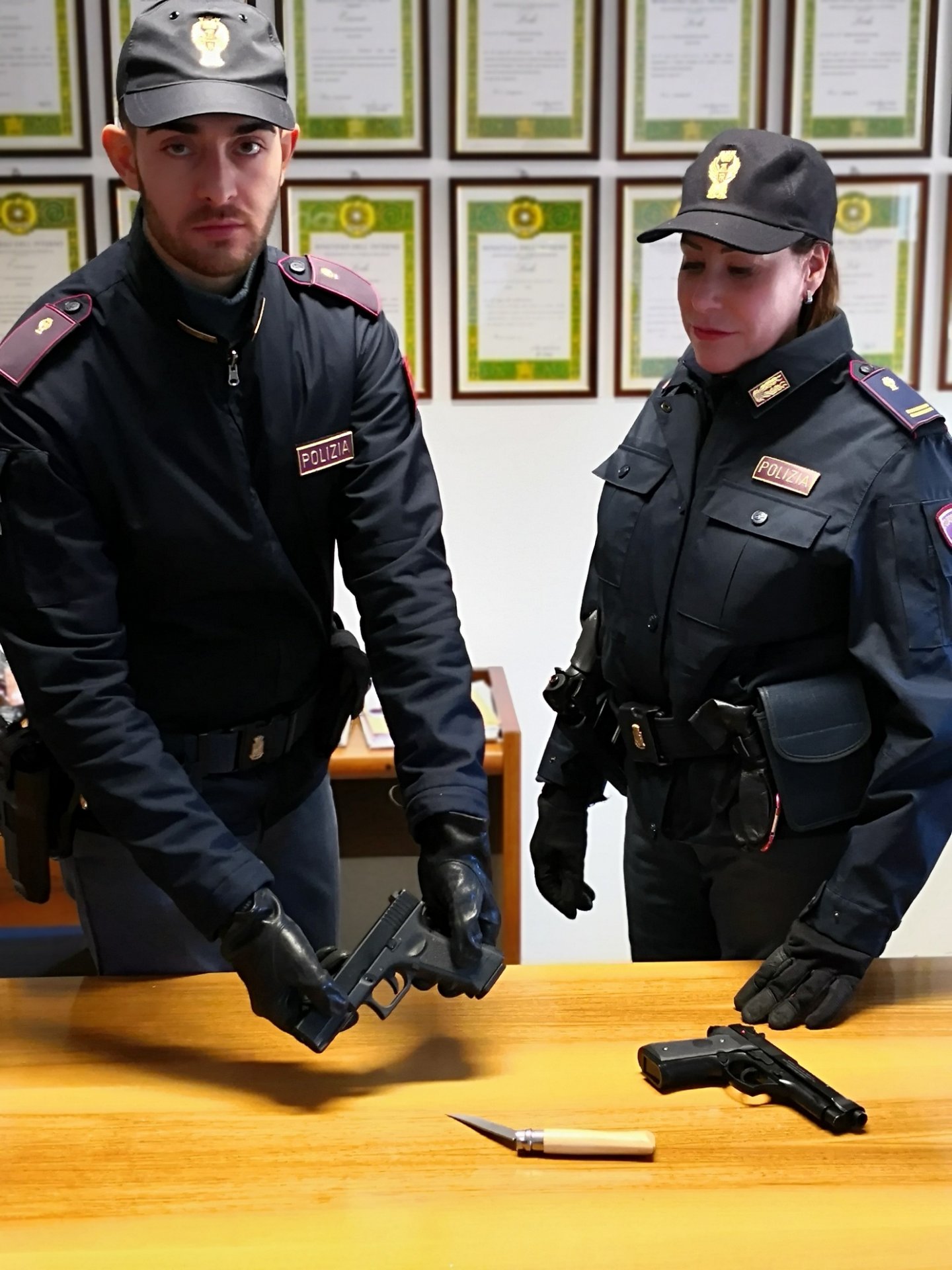 Nella disponibilità l’arrestato aveva un’auto dello stesso tipo, modello e colore di quella segnalata in alcune rapine avvenute le notti precedente ai danni di coppiette. All’interno del mezzo era stato rinvenuto un coltello ed una pistola giocattolo, replica fedele di una Glock.