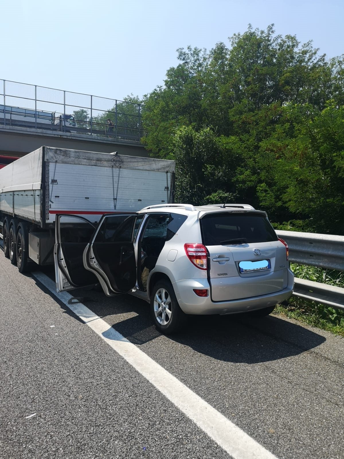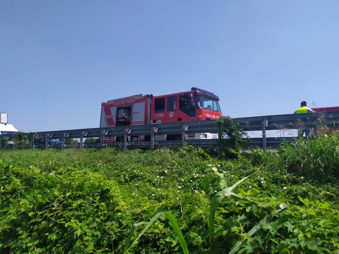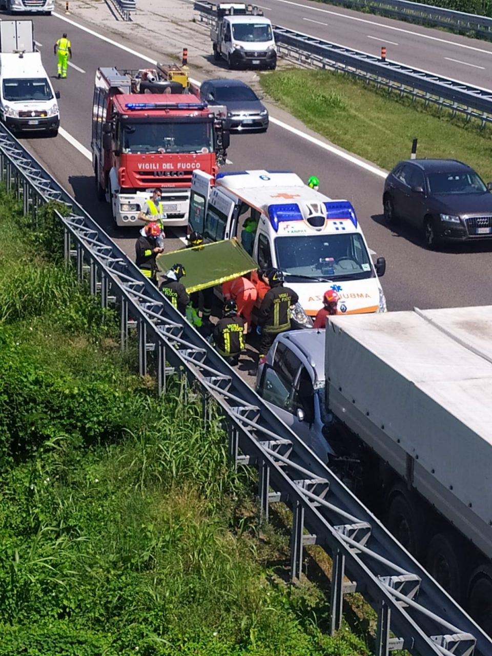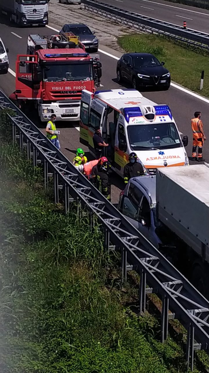 Da una prima ricostruzione dei fatti sembra che un uomo a bordo di un furgoncino abbia tamponato un camion e si sia incastrato sotto il mezzo: i soccorsi sono al lavoro per salvargli la vita.