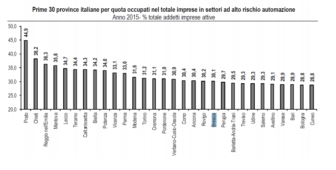 In una nazione che è settima a livello mondiale, Brescia risulta l’undicesima provincia per quota di occupati in “settori a rischio automazione” (così Confartigianato ha bollato il fenomeno).