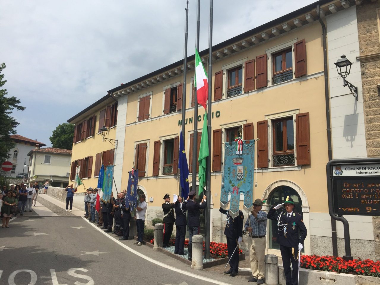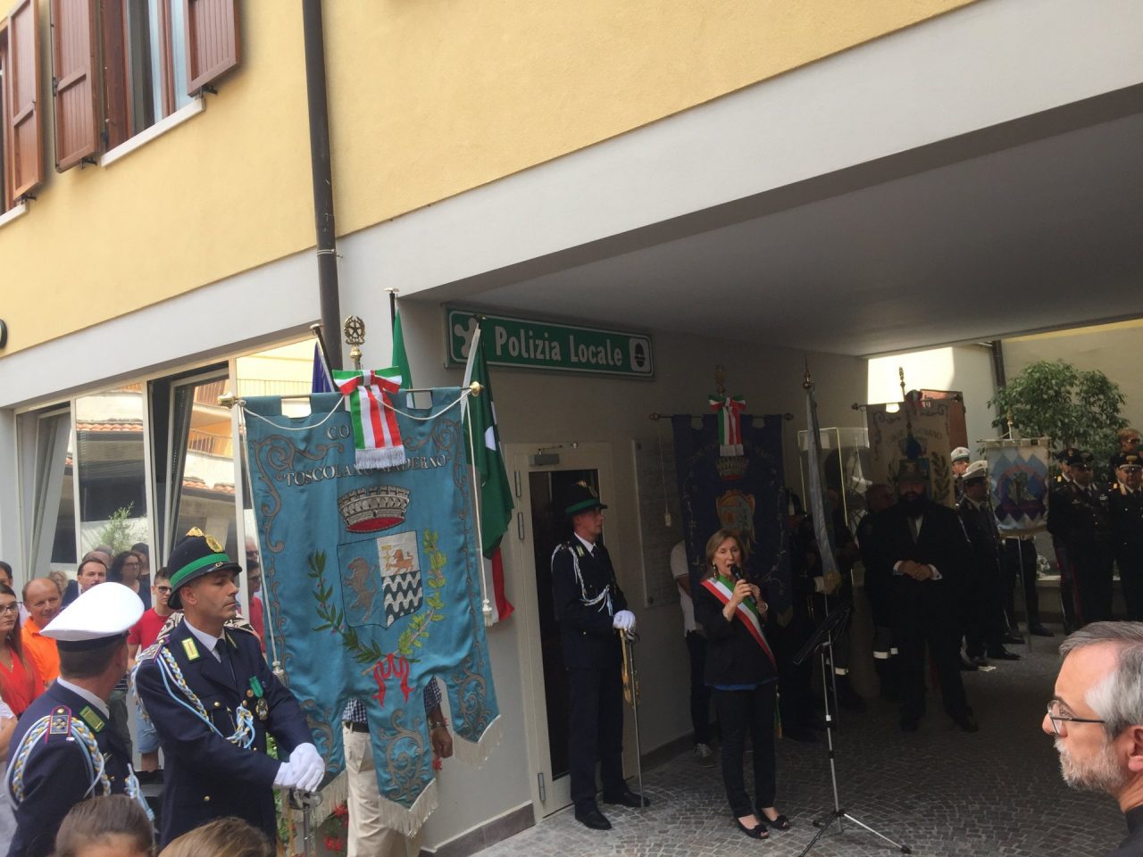 Dopo la cerimonia dell’alzabandiera, il folto corteo ha raggiunto il cortile interno del Municipio dove ha sede il comando dei Vigili. Lì alcune autorità hanno voluto condividere con la folla presente alcuni ricordi di Gino Zanardini a un anno dalla sua scomparsa non senza momenti di vera commozione. Toccante la lettera dedicata a Gino dai colleghi toscomadernesi letta da Diletta Zumbo, all’epoca del fatto in forza alla Locale era stata la compagna di Zanardini durante il tragico sopralluogo.