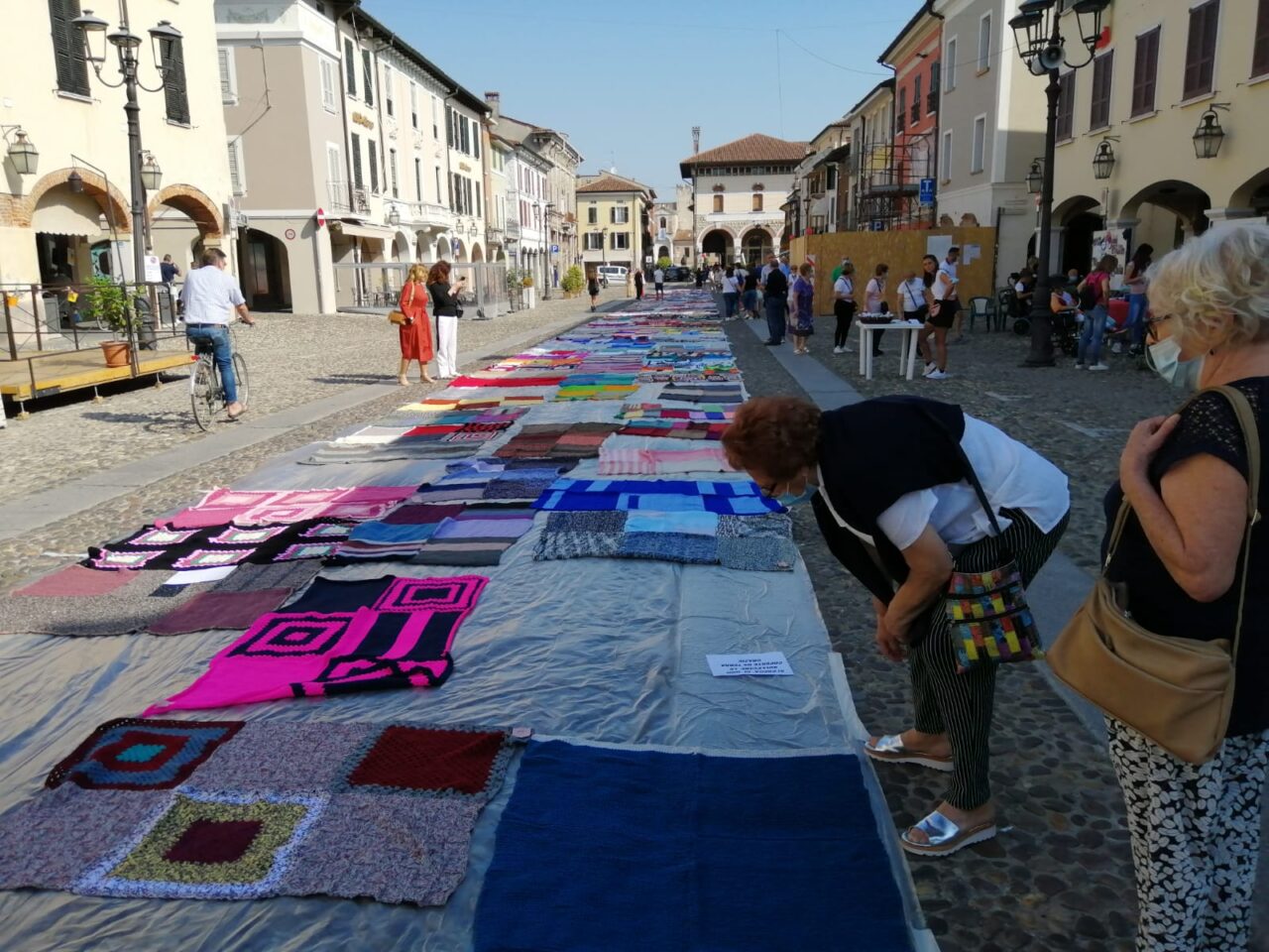 Questa mattina la piazza Vittorio Emanuele di Orzinuovi è stata coperta da più di 600 coperte tutte cucite a mano da donne di Orzinuovi e non solo, per l’evento benefico «Un quadrotto per cucire relazioni». Tantissimi, anche da Parma e Pavia, hanno portato i loro quadrotti per poterli vendere. Il ricavato verrà donato all’associazione Oasi che si occupa dei ragazzi disabili del territorio, per aiutarli a vivere esperienze che permettano loro di inserirsi in società. L’iniziativa è stata organizzata dal consigliere comunale Tiziana Brizzolari e da Paola Grande di Grandi Filati.