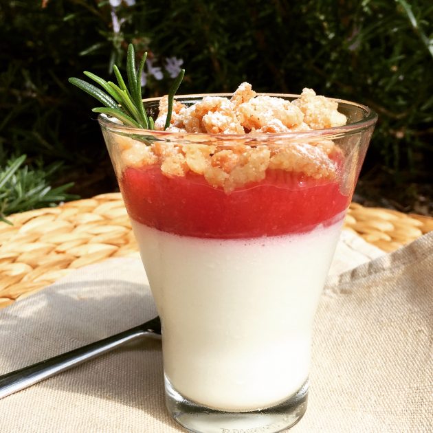 Una base cremosa di panna arricchita da una coulis di lampone e da un aroma delicato di rosmarino. Per finire un crumble croccante di biscotto. Semplicità, originalità e gusto in un bicchiere. Silvia Congiu preparerà una versione simpatica di un classico dolce italiano, famoso nel mondo: la panna cotta. Aromatizzata con il rosmarino acquista quella nota in più che fa la differenza. Un dolce monoporzione adatto per tutte le occasioni, per un fresco e insolito fine pasto.