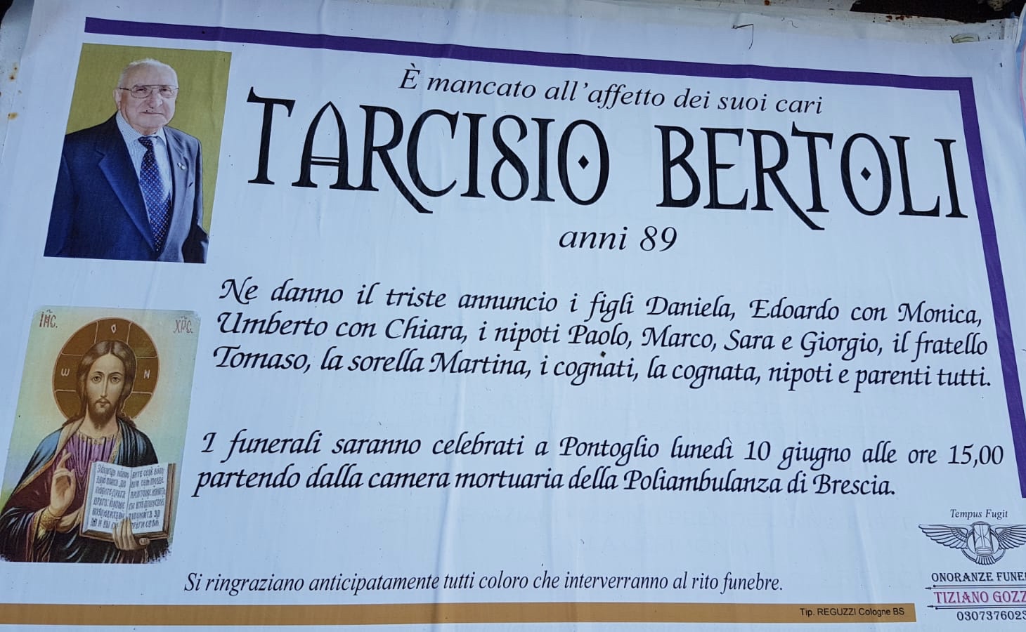 Le esequie saranno celebrate lunedì, 10 giugno, alle 15 nella chiesa parrocchiale. La salma partirà dalla camera mortuaria della Poliambulanza di Brescia.