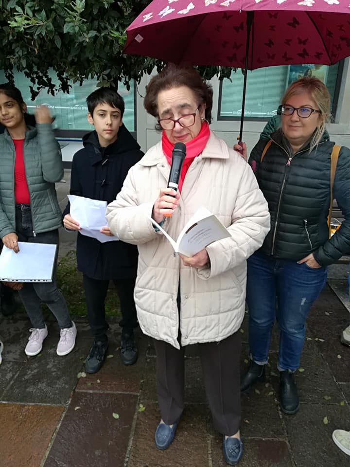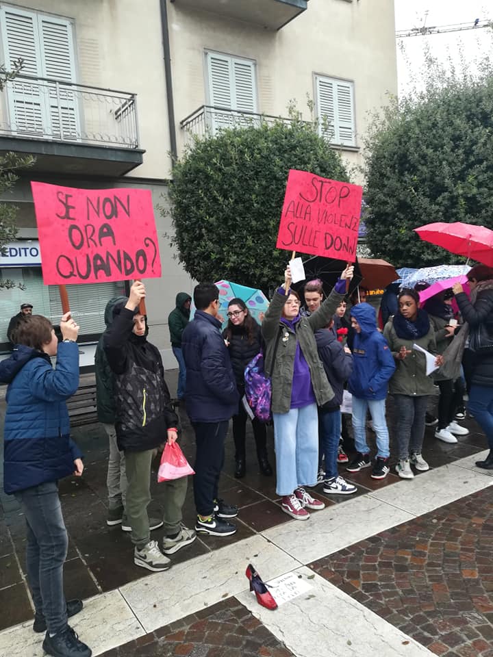 Nonostante la pioggia battente, la mattinata è stata partecipata.  La piazza, gremita da oltre un centinaio di persone, si è stretta sotto gli ombrelli attorno ai nomi delle 142 vittime di femminicidio del 2018. Accanto a ciascuna targa preparata dagli studenti, un paio di scarpette rosse. I presenti hanno sfilato tra il susseguirsi delle storie delle donne mancate per mano di mariti, compagni, colleghi, uomini violenti per posizionare il simbolo fulcro della Giornata Mondiale contro la violenza sulle donne.
