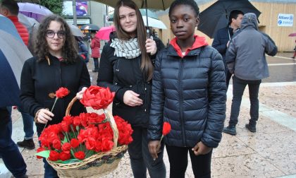Dopo la lettura di poesie e riflessioni da parte dei ragazzi, sono stati distribuiti fiori di carta per invitare a prendere posizione sul tema.