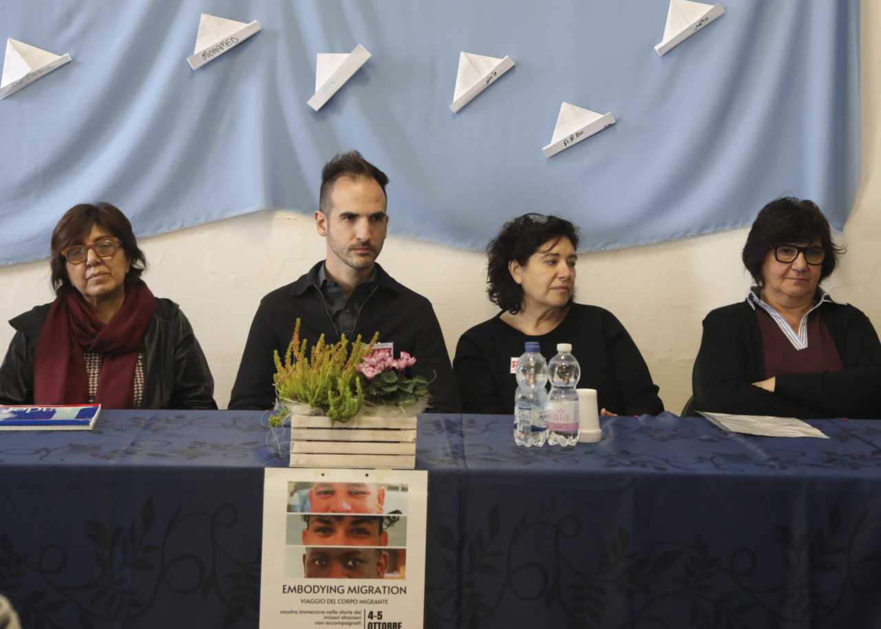 Taglio del nastro per Embodying Migration (Viaggio del corpo migrante) a Palazzo della Volta ad Acqualunga che da ieri e per tutto la giornata di oggi farà da traghettatore tra le onde della vita dei giovani migranti.