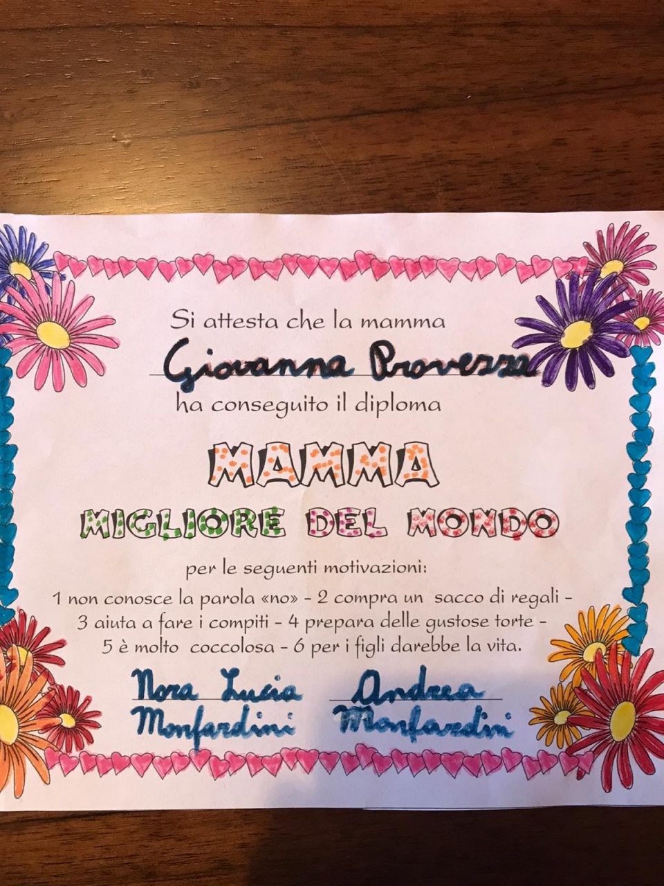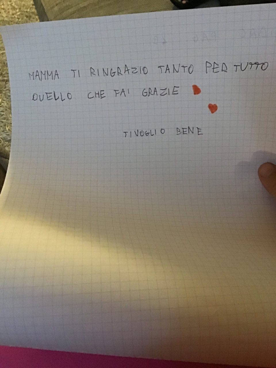 Cara mamma, ti ringrazio per tutte le volte che mi aiuti nelle difficoltà. Sei sempre affettuosa e gentile e quando sono con te mi sento al sicuro. Ti voglio bene! – Matteo Verzelletti