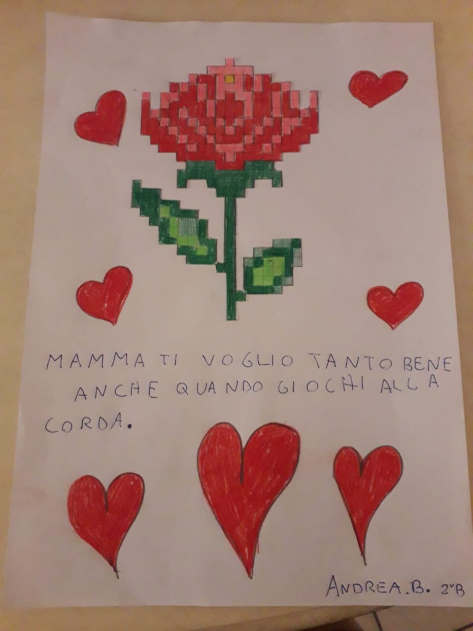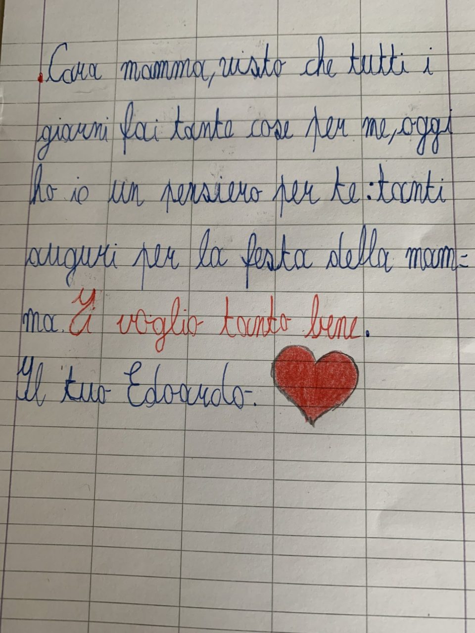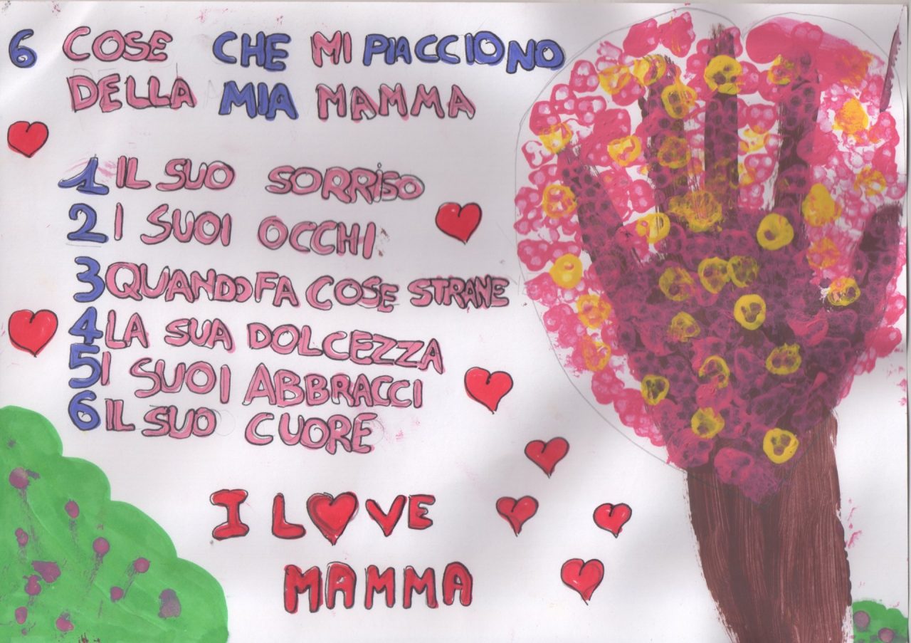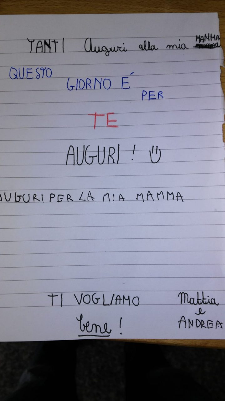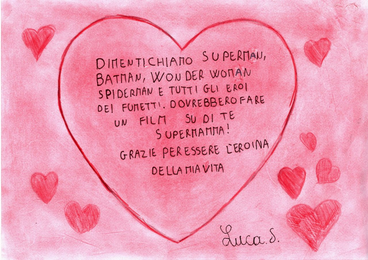 Per la mia mamma. Mamma grazie per il tuo aiuto. Lo so che ce la posso fare. E che da grande quando andrò a lavoro tu non potrai aiutarmi e quindi ho deciso di impegnarmi. Ringrazio anche le maestre per tutto il loro impegno. Auguri mamma, ti amo tanto – Lorenzo Tamanza