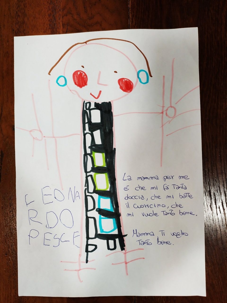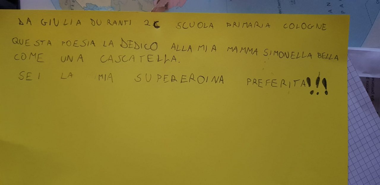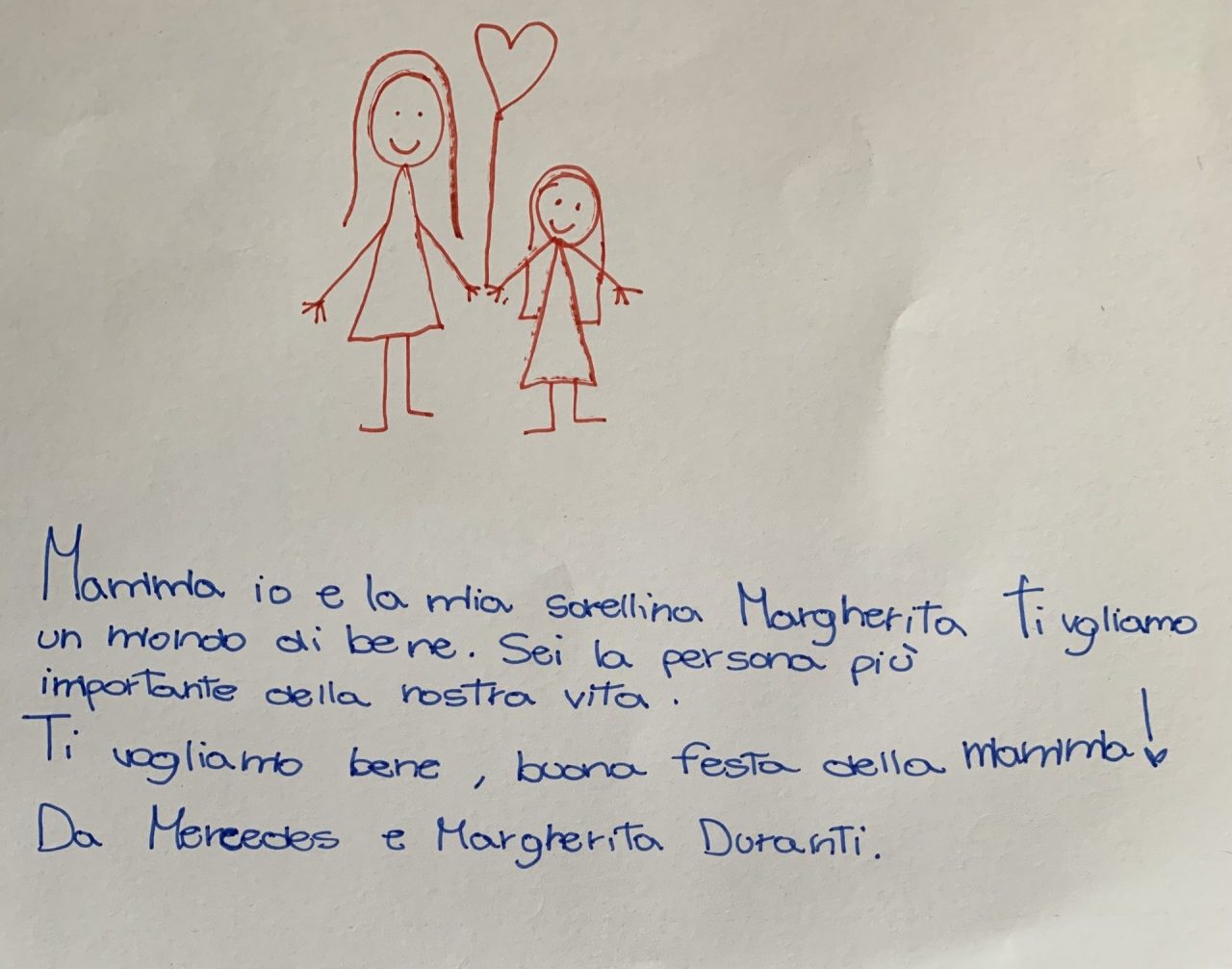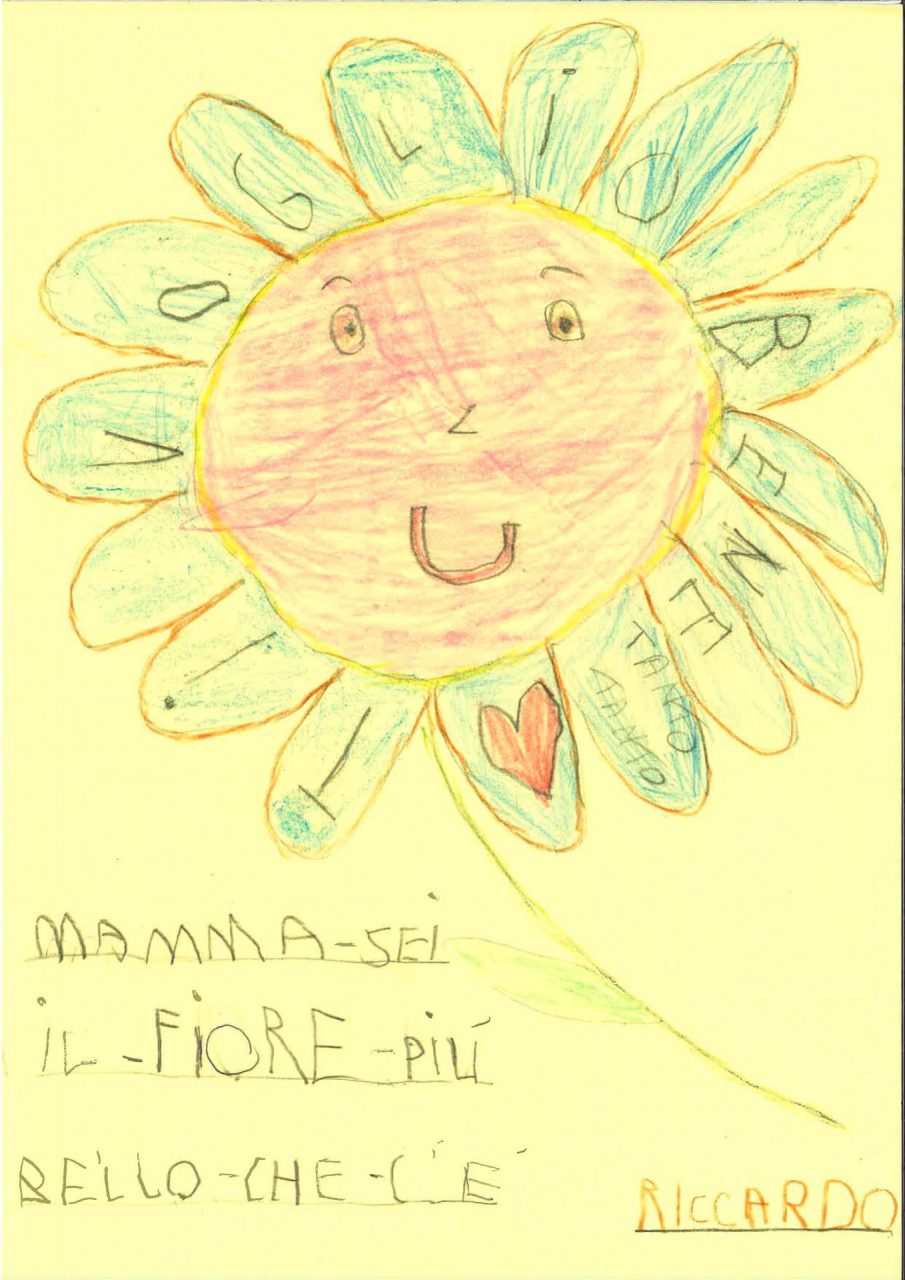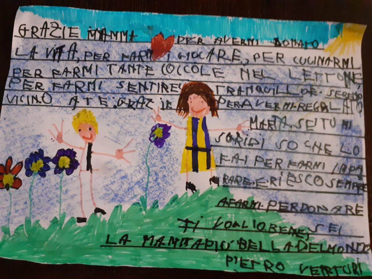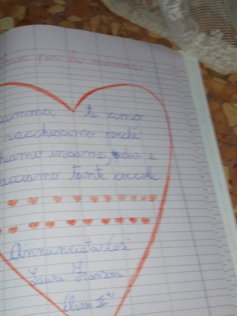 Per la mia mamma. Mamma grazie per il tuo aiuto. Lo so che ce la posso fare. E che da grande quando andrò a lavoro tu non potrai aiutarmi e quindi ho deciso di impegnarmi. Ringrazio anche le maestre per tutto il loro impegno. Auguri mamma, ti amo tanto – Lorenzo Tamanza