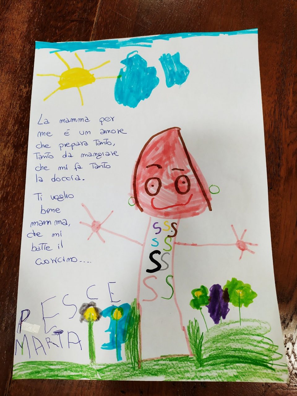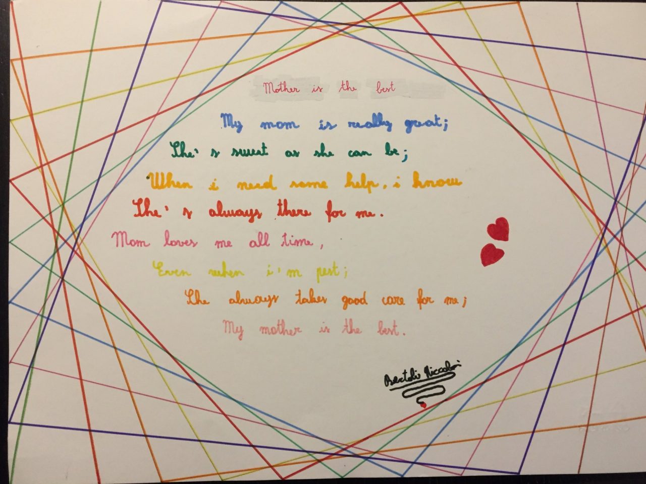 La mia mamma é dolce e carina, mi aiuta ogni giorno, ogni sera e ogni mattina, mi rassicura se sono giù e con i suoi abbracci mi tira su! Perché lei è la mia amica migliore e rende la vita di ogni colore. – Paolo Bosetti