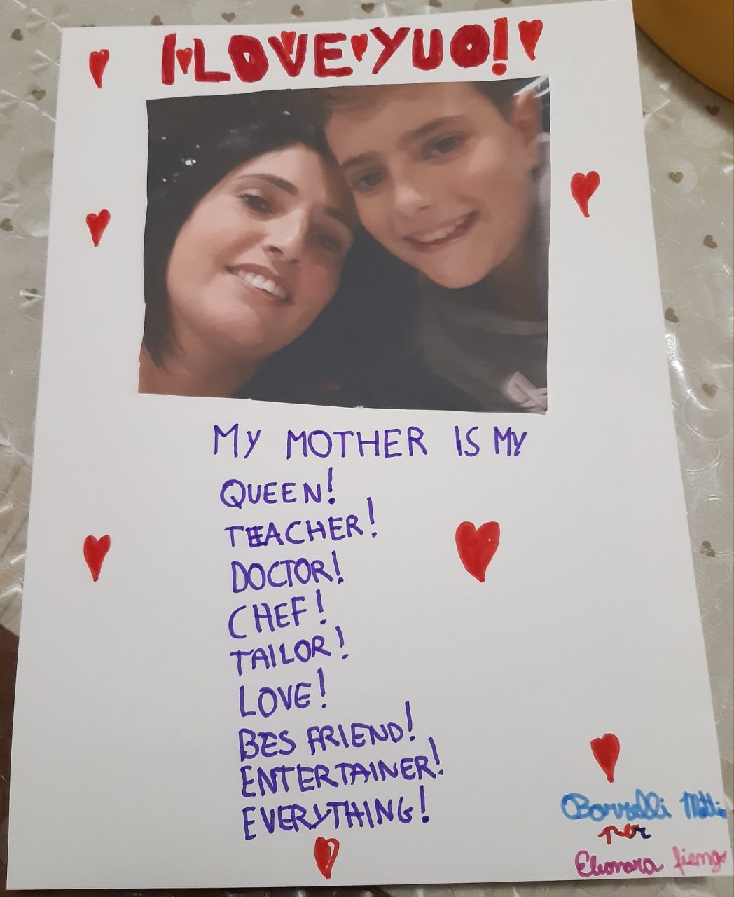 Adoro la mia mamma perché mi sta sempre vicino e mi aiuta nelle difficoltà.. Adoro la mia mamma perché è la più simpaticissima dell’universo e mi fa’ sempre ridere; Adoro la mia mamma perché mi rassicura sempre; La mia mamma è unica…perché è la mia mamma. – Christian Mari
