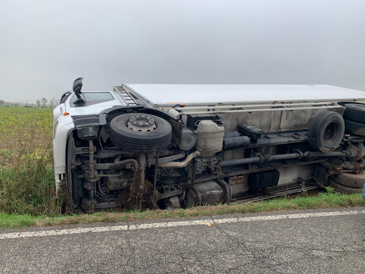 Tir ribaltato tra Castrezzato e Cossirano. Sul posto i Vigili del fuoco di Chiari, nessuno è rimasto ferito nell’incidente.