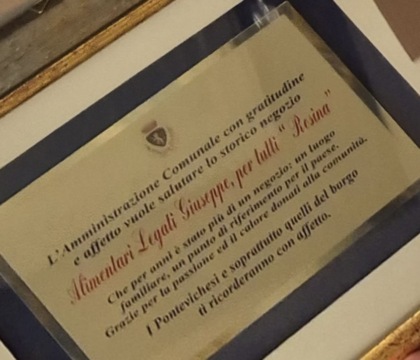 Sulla targa consegnata per mano del sindaco Luca Bosio, alla presenza di altri membri della maggioranza, al proprietario dell’attività Beppe (all’anagrafe Giuseppe Legati) si legge «l’Amministrazione comunale con gratitudine e affetto vuole salutare lo storico negozio “Alimentari Legati Giuseppe” per tutti “Rosina”, che per anni è stato più di un negozio: un luogo famigliare, un punto di riferimento per il paese. Grazie per la passione ed il calore donati alla comunità. I pontevichesi, e soprattutto quelli del Borgo, ti ricorderanno con affetto».