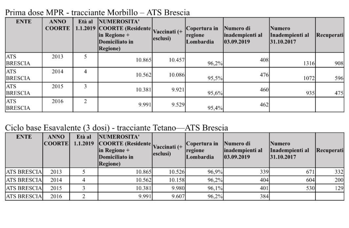 I dati relativi alle copertura raggiunte con le vaccinazioni ‘Esavalente’ e ‘Trivalente’ per i nati dal 2013 al 2016 dall’Ats di Brescia.