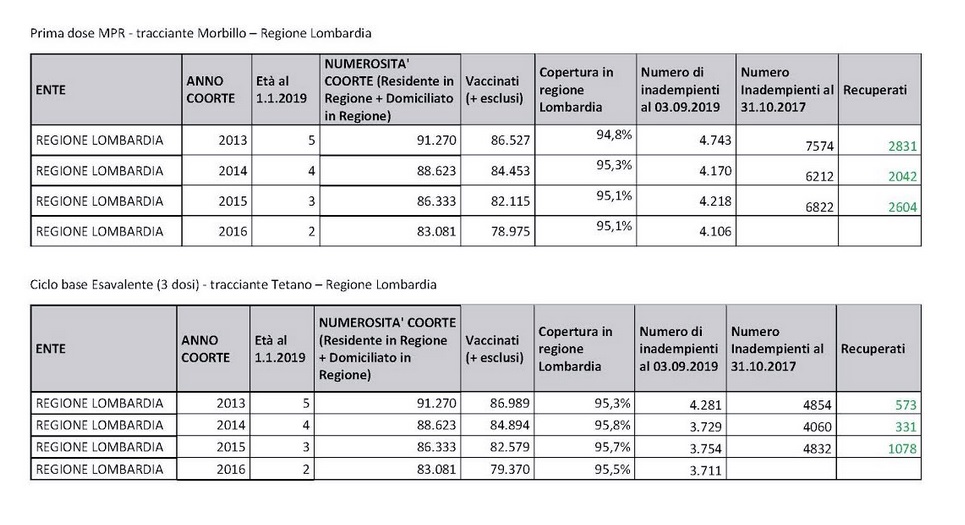 Parotite e Rosolia) superano il 95%”. Lo fa sapere l’assessore al Welfare della Regione Lombardia, Giulio Gallera, commentando i dati sulle coperture vaccinali all’apertura dell’anno scolastica 2019/2020 e a seguito delle campagne di informazione e sensibilizzazione che la Regione Lombardia ha messo in campo in questi anni, fra le quali anche la possibilita’ di accedere agli ambulatori anche senza appuntamento fino allo scorso 31 agosto scorso. “In Lombardia sono stati vaccinati per l’Esavalente 333.832 bambini di eta’ compresa fra 2 e 6 anni . Con appena 15.475 inadempienti, residenti o domiciliati in Regione. Per la Trivalente, invece, i vaccinati sono 332.070 con mancate somministrazioni per 17.237 bambini”, ha aggiunto Gallera.