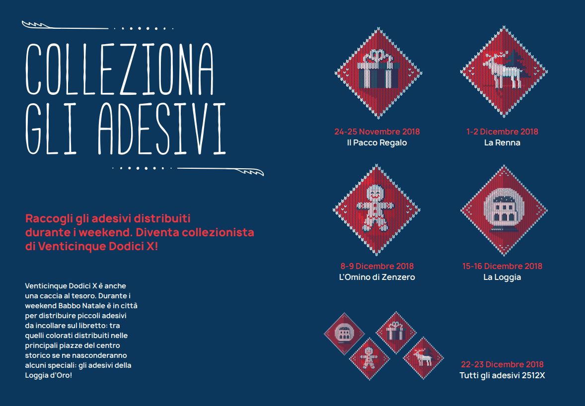 Una delle novità più grandi di quest’anno sarà la “caccia agli adesivi” ideata dai ragazzi di Blab studio. Il libretto informativo degli eventi sarà infatti un passaporto, dove i partecipanti potranno attaccare degli adesivi speciali. Durante le speciali domeniche natalizie infatti Babbo Natale sarà in città, per distribuire quattro piccoli adesivi, da poter attaccare sul programma. Ogni domenica ne sarà distribuito uno diverso, mentre l’ultima domenica saranno disponibili tutti e quattro. Gli adesivi raffigurano, un pacco regalo, una renna, un omino di pan di zenzero, e Palazzo Loggia, tre dei simboli più classici del Natale, insieme al palazzo più caratteristico della città. Non c’è però caccia al tesoro che si rispetti senza un premio, per questo oltre agli adesivi stantard all’interno del sacco di Babbo Natale si potranno trovare anche 100 logge d’oro. I fortunati che pescheranno l’adesivo patinato in oro dal sacco di Babbo Natale avranno in regalo una tazza con il logo di Venticinque dodici X. Il libretto lo si potrà trovare negli infopoint, nei negozi aderentie nelle sedi delle realtà aderenti all’iniziativa, ed è inoltre scaricabile dalla pagina facebook e dal sito del comune di Brescia