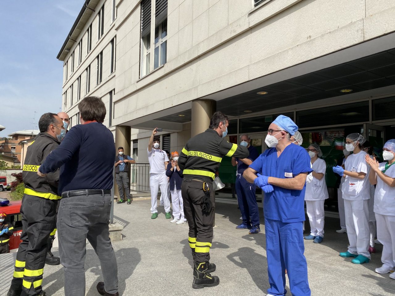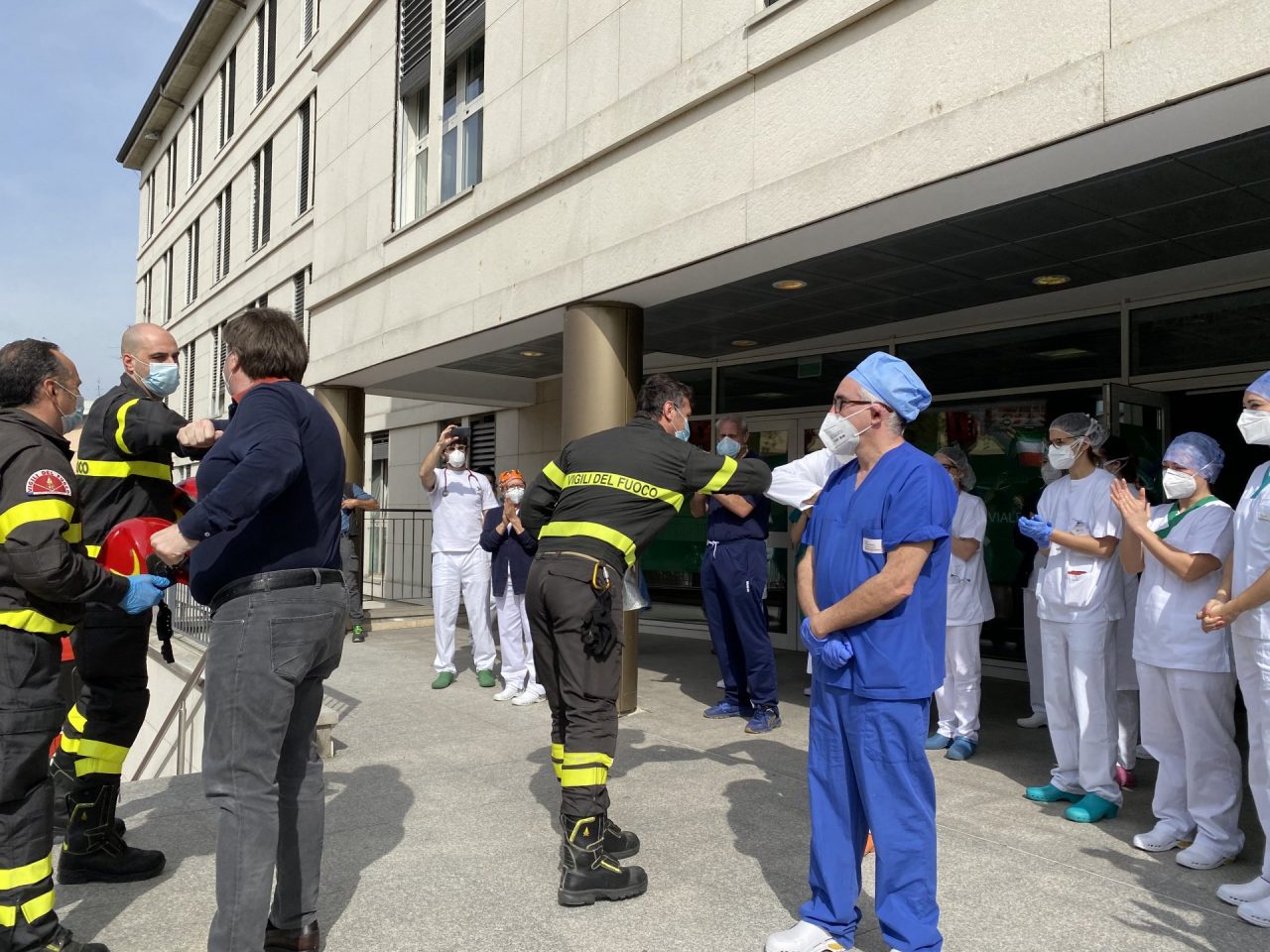 Un momento sentito, un attimo di vicinanza.. seppur distanti. Un “grazie” e un saluto da chi è ugualmente, costantemente, in prima linea. I Vigili del fuoco. Eppure, dal profondo del loro cuore buono è arrivato il bisogno di farsi sentire dagli altri eroi di questa situazione: tutti coloro che sono negli ospedali, che ci lavorano e combattono contro un nemico invisibile.