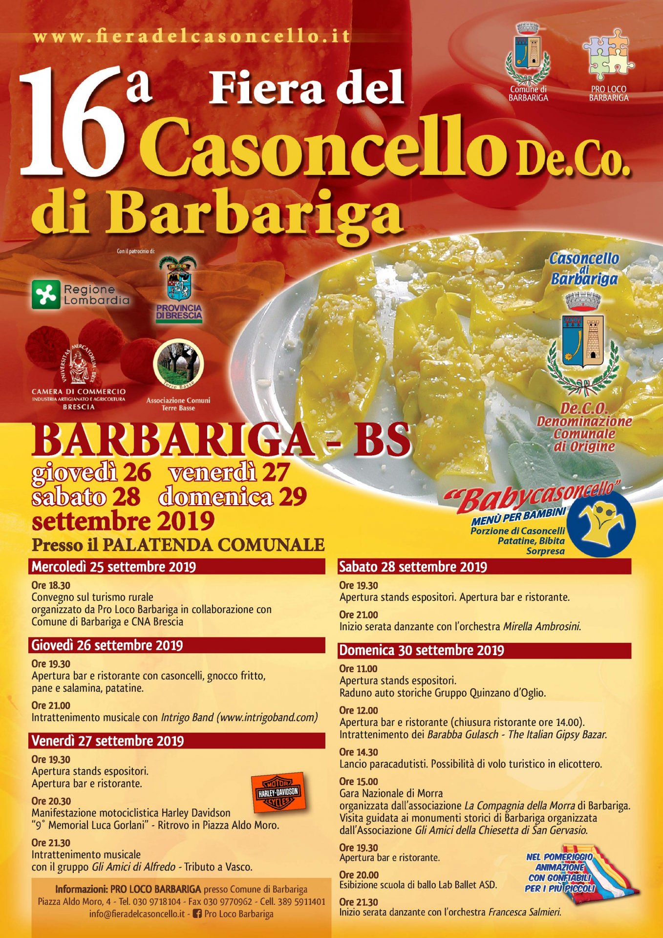 Era il 2004 quando l’Amministrazione Comunale di Barbariga decide di organizzare in paese la prima “Festa del Casoncello Bresciano” per far conoscere e valorizzare il casoncello locale. Negli anni seguenti, con la nascita della Proloco di Barbariga nel 2005, l’evento si trasforma nella “Fiera del Casoncello De.Co. di Barbariga“, una manifestazione in più giorni dedicata alla scoperta e alla degustazione del Casoncello bresciano, e non solo.
