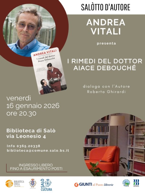 Appuntamento venerdì 16 gennaio 2026 alle 20.30 nei locali del Salo’tto della Cultura (via Leonesio 4) – biblioteca di Salò. L’autore parlerà del suo nuovo romanzo edito da Garzanti. Converserà con Roberta Ghirardi.