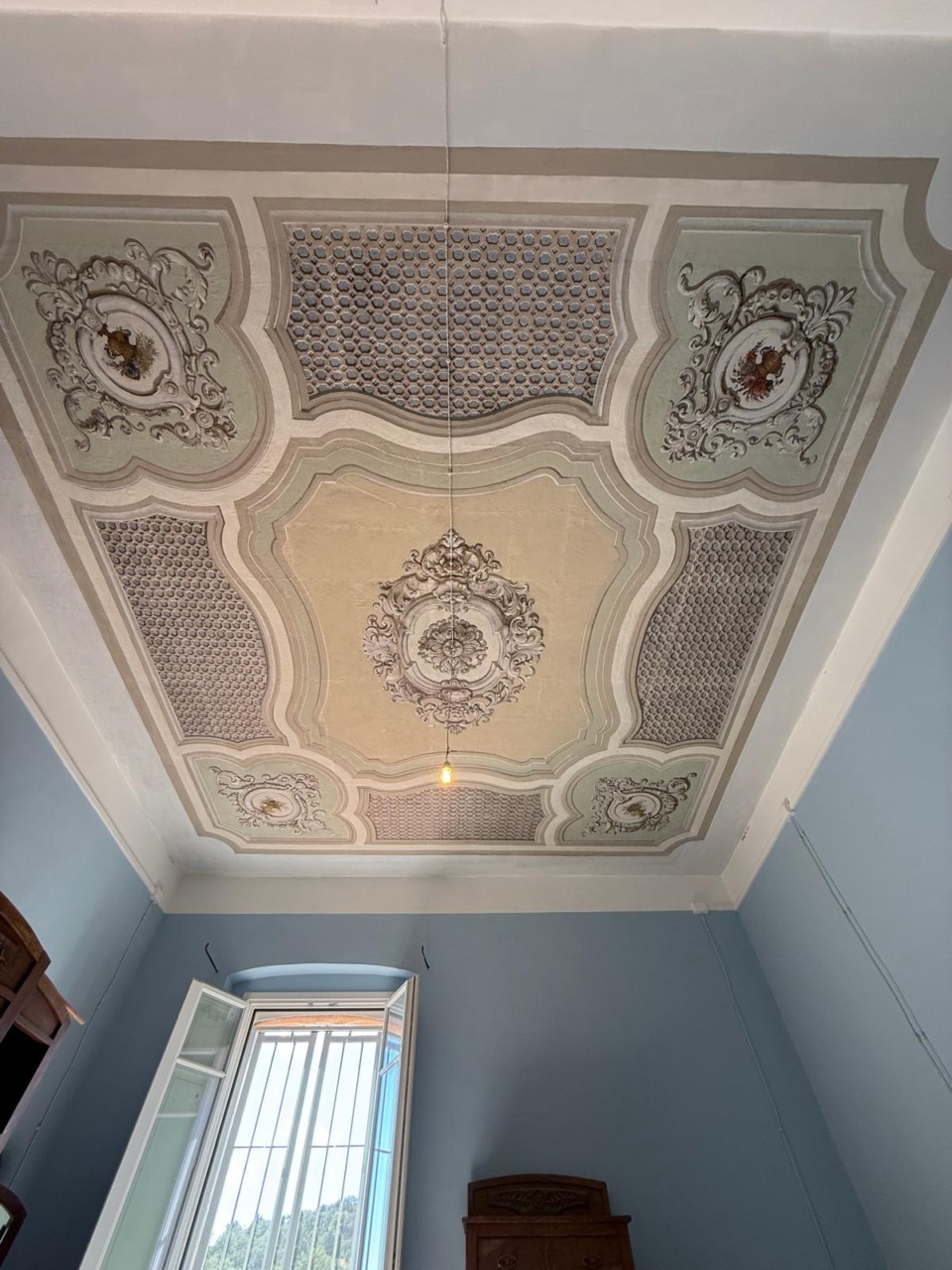 Tale soffitto versava in condizioni drammatiche, solo il 20% dell’apparato decorativo era leggermente visibile, cosí l’ho dovuto tagliare in listelli quadrati che ho poi ricomposto in fase di restauro. Fortunatamente esistevano vecchie fotografie da cui ho attinto molti elementi che erano andati perduti. Una volta restaurati parzialmente tutti i tasselli, sono tornato in Calabria per ricollocare l’intera decorazione ad un nuovo soffitto in cartongesso. Un’operazione complessa e faticosa, che ha richiesto l’incollaggio e il ritocco di tutte le giunture e il recupero totale dell’intero apparato decorativo. Una fatica immane sia fisica che mentale, ma la bellezza di quei luoghi, il mare, il buon cibo e l’accoglienza delle persone hanno reso il mio lavoro e il mio lungo soggiorno pieno di ricordi indelebili che rimarranno sempre nel mio cuore. Oltre all’immensa soddisfazione di aver salvato, riportandolo alla luce, questo splendido soffitto decorato in un’epoca che conosceva solo l’armonia e la bellezza”.