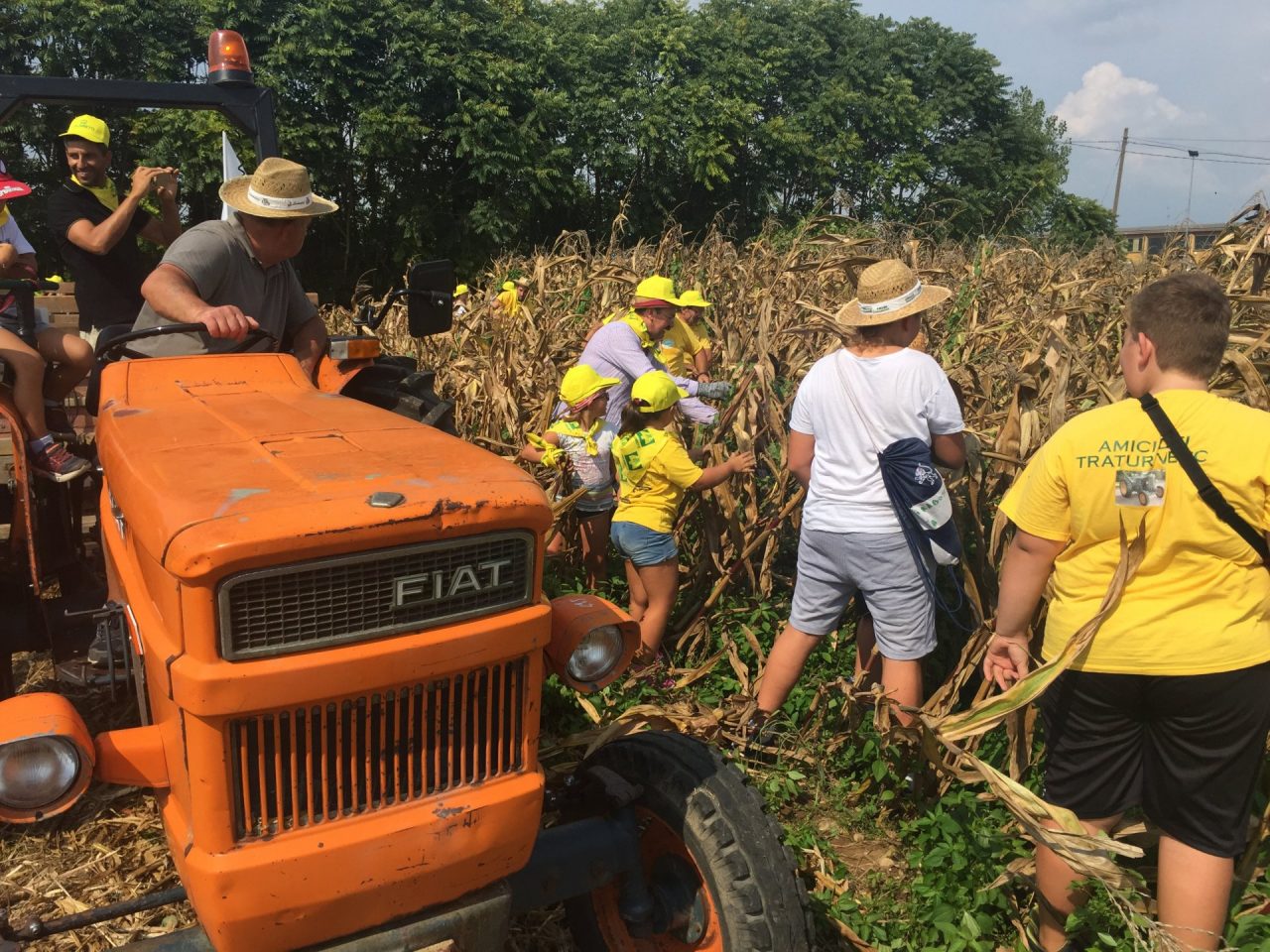 A bordo di trattori d’epoca, forniti dall’associazione “Amici dei tratur vecc”, un lungo corteo ha attraversato il territorio partendo dal piazzale dei Tigli lungo via fiume Oglio per arrivare alla cascina Cacciatore, dove ha avuto inizio la raccolta. Abbellita dall’esposizione degli acquerelli dell’artista Franco Tassoni, la cascina è rimasta animata fino a sera, quando si è preceduto a togliere a mano gli “scarfòi” dalle pannocchie e a separare i chicchi con un’antica macchina sgranatrice.