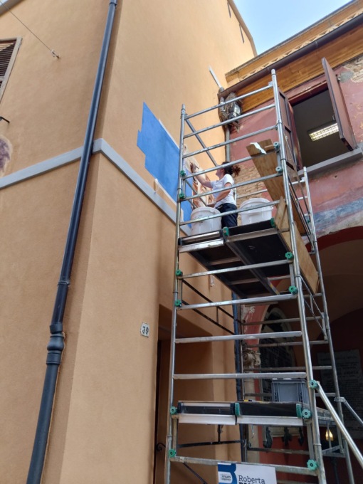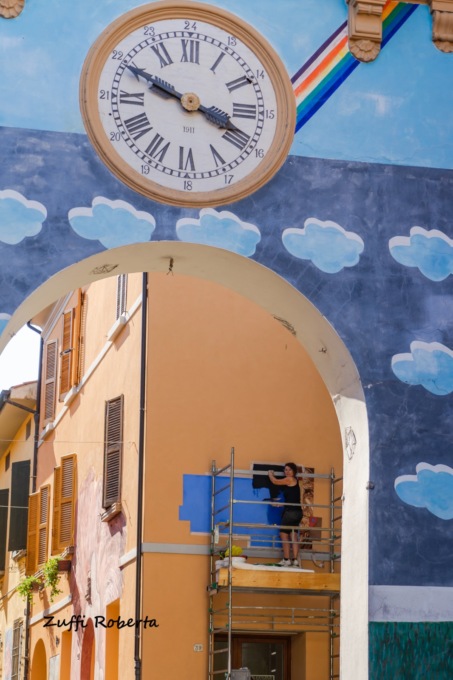 Dozza, che si trova tra Bologna e Imola, è famosa perché da oltre 60 anni porta avanti la tradizione dei muri dipinti, la Biennale invece è alla sua 29esima edizione, che la rendono un museo a cielo aperto, non a caso è inserita tra i Borghi più belli d’Italia. Questa edizione poi è ancora più speciale perché accanto agli artisti, che lavorano sapientemente e temerariamente (la stessa Pancera ha dovuto lavorare su di una impalcatura a 3,5 metri d’altezza), c’erano i restauratori che davano nuova vita alle opere più datate.