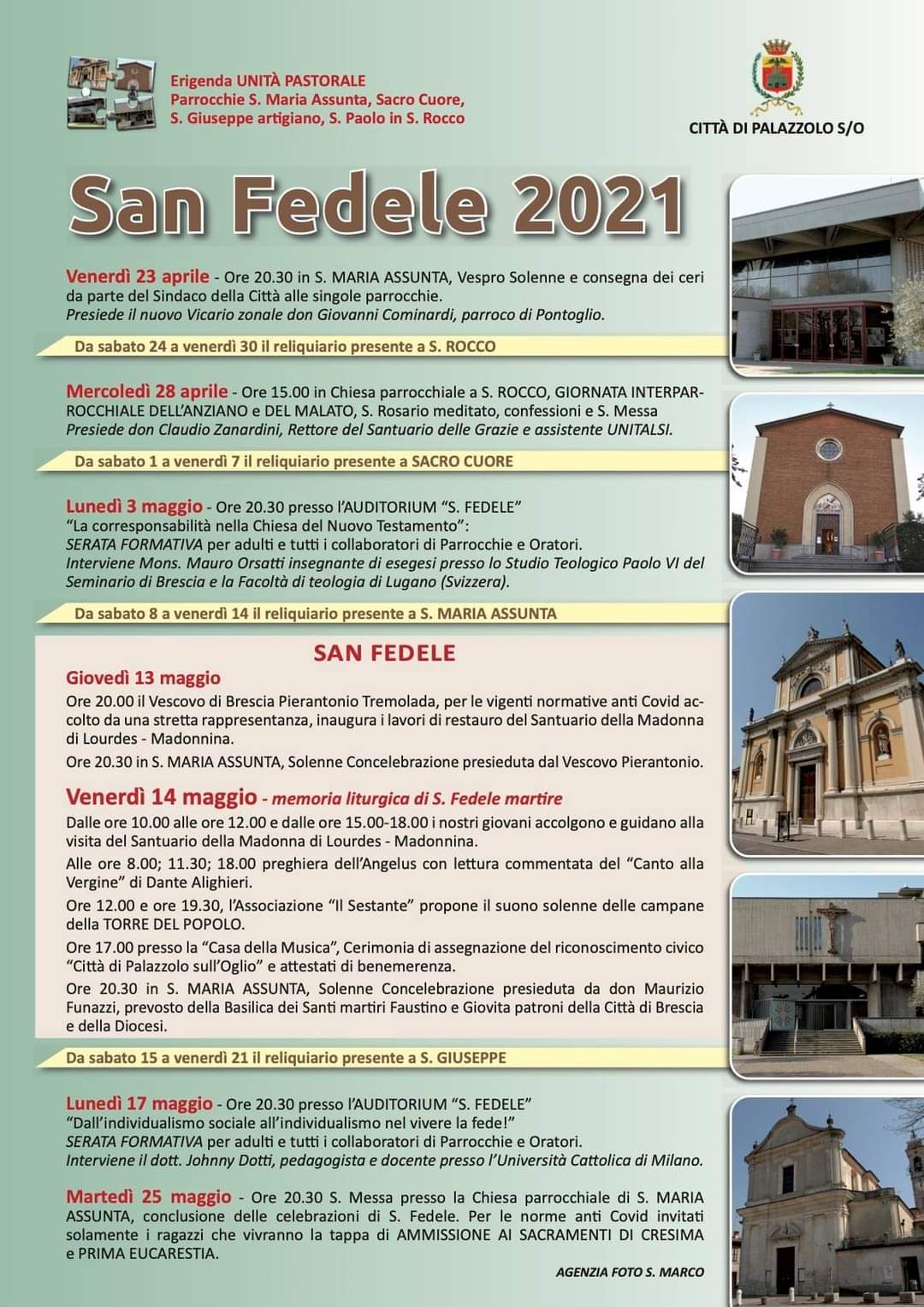 Hanno preso il via ieri, con il vespro solenne e la consegna dei ceri alla Città e alle quattro parrocchie dell’unità pastolare, i festeggiamenti per San Fedele, Santo patrono di Palazzolo sull’Oglio. Un’occasione di riflessione, ma anche per coltivare “quella nuova prospettiva collettiva, quella dimensione di socialità e comunità ” che l’anno del Covid ha portato a riscoprire.