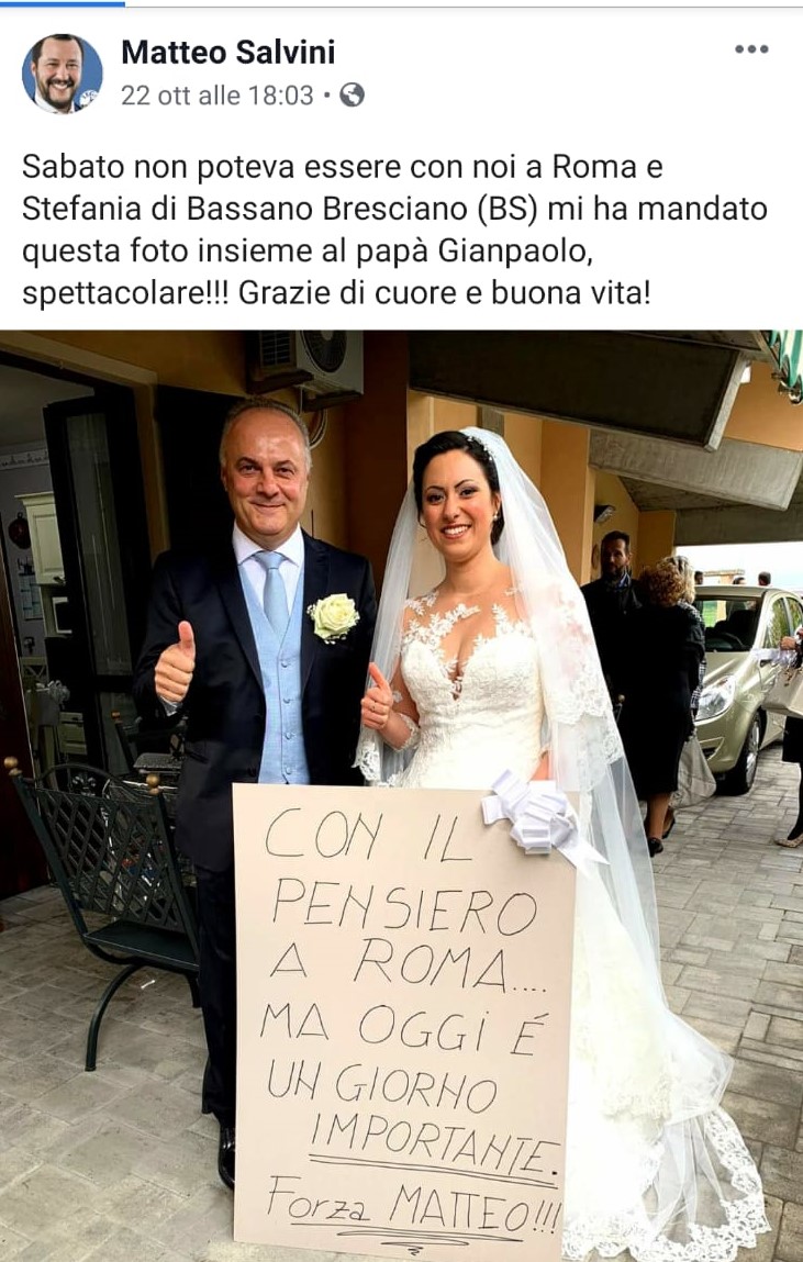 Ci sono giorni che non si possono dimenticare. E, a quanto pare, anche certe persone.  E’ il caso di Stefania Seniga che sabato, pur non potendo presenziare al raduno della Lega a Roma, non ha mancato di rivolgere un pensiero al leader del Carroccio Matteo Salvini. L’«impedimento»? Nientemeno che un appuntamento all’altare con il neo marito Riccardo. L’assenza, dunque, di direbbe più che giustificata. Per «rimediare» la sposa ha deciso di inviare al suo «capitano» una foto con papà Gianpaolo e un eloquente cartello: «Con il pensiero a Roma… ma oggi è un giorno importante. Forza Matteo!!!»