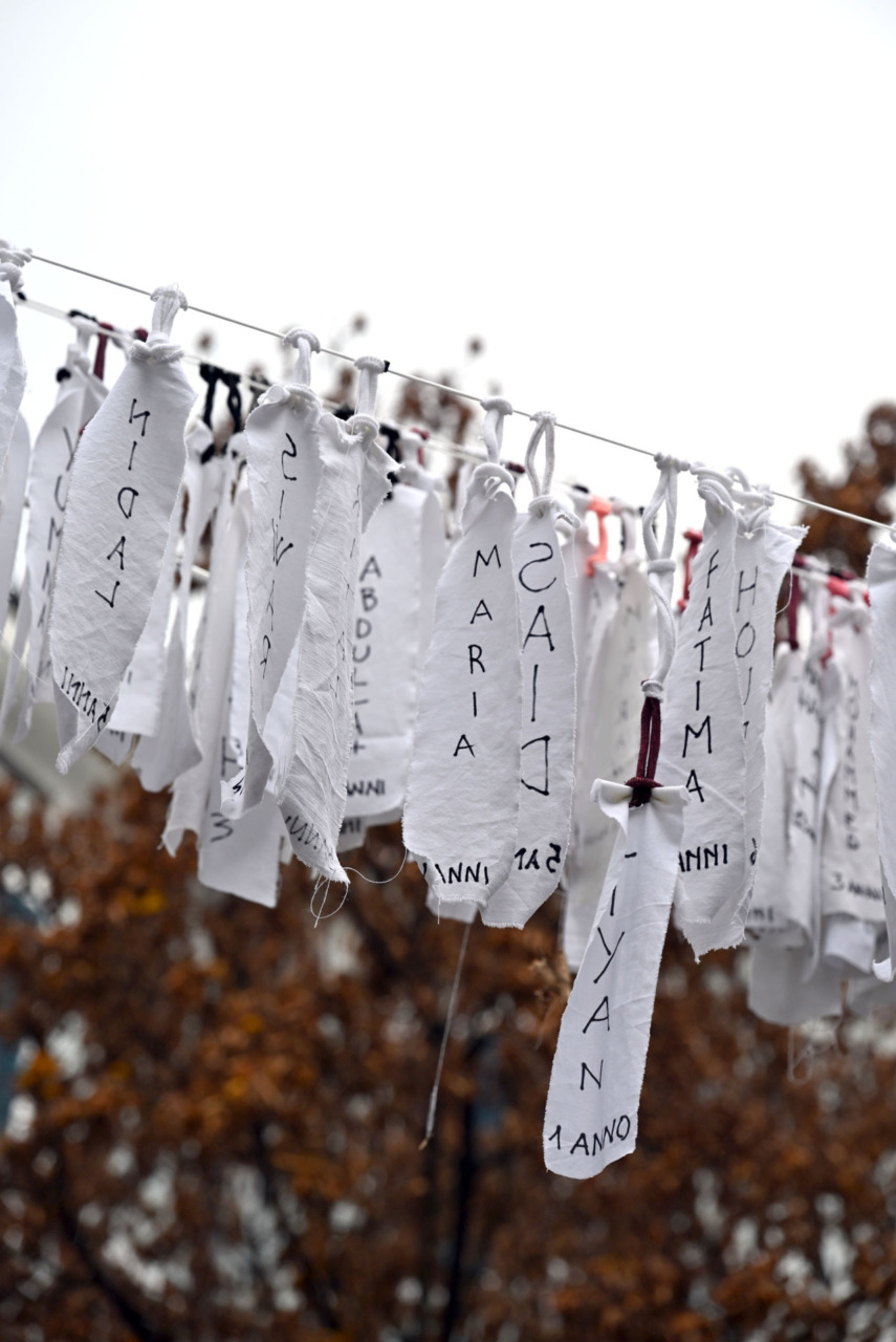 “I nomi, scritti sulle strisce ora sospese tra le colonne del Mo.Ca, si muovono al vento, in un’istallazione che è faticoso ma doveroso guardare, che suscita emozioni profonde ma che, nel contempo, restituisce un percorso di partecipazione e di sensibilizzazione attraverso il quale il dolore si è trasformato in un gesto collettivo di memoria e di pace”.
