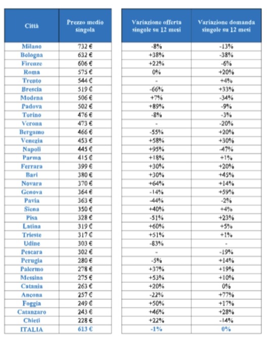 Quella più costosa è Milano, con 732 euro al mese, mentre il canone medio in Italia è pari a 613 euro. Al secondo posto tra le più dispendiose per i fuori sede c’è Bologna (632 euro), seguita da Firenze (606 euro). Al quarto gradino della classifica si piazza Roma (575 euro), poi ci sono Trento (544 euro), Brescia (519 euro), Modena (506 euro), Padova (502 euro), Torino (476 euro) e infine Verona (473 euro).