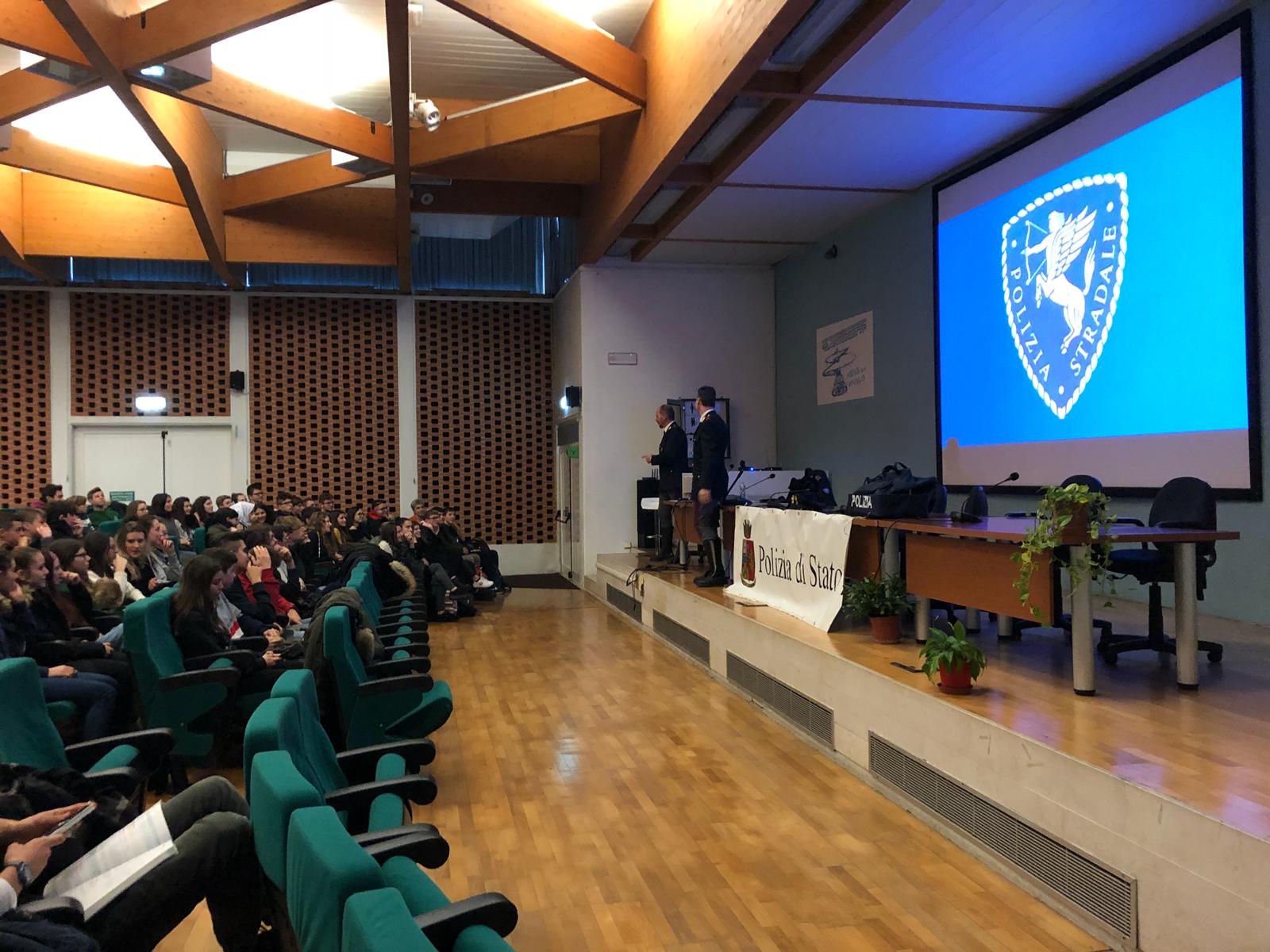 Gli agenti della Polizia Stradale, Stefano Porcaro e Claudio Mastrototaro, hanno tenuto una lezione di sicurezza stradale alle classi terze dell’Antonietti.
