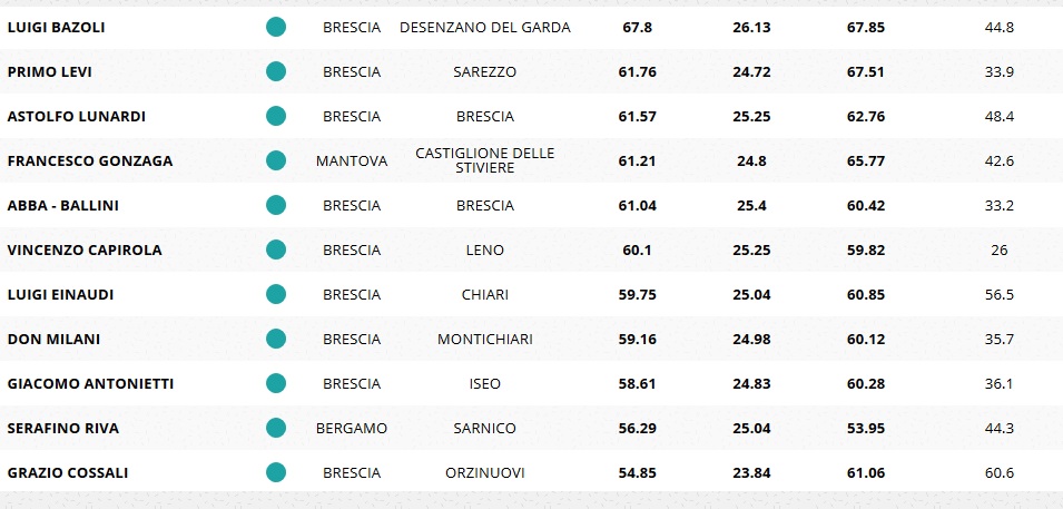 Anche in questo caso la provincia supera la città con il primo posto al Don Milani, seguito dal Marzoli di Palazzolo sull’Oglio e dal Francesco Gonzaga di Castiglione delle Stiviere (provincia di Mantova).