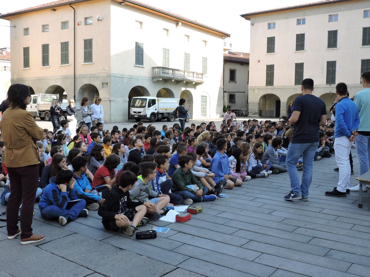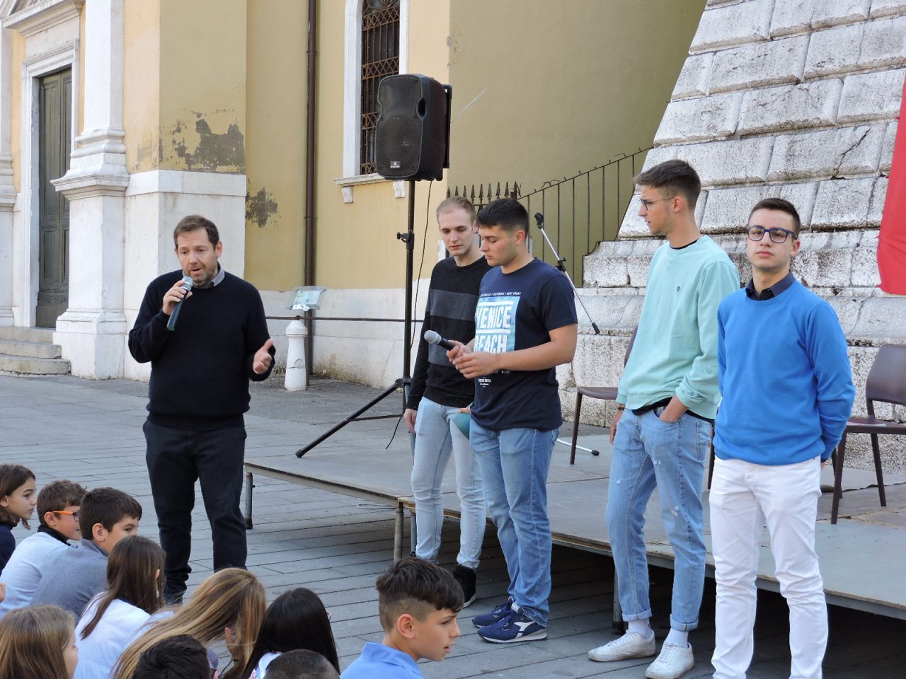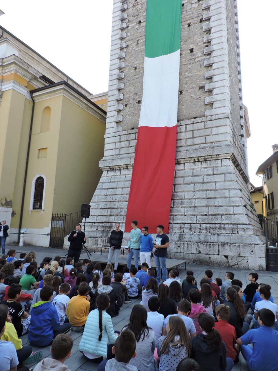 Tutti gli studenti delle primarie e della secondaria di primo grado, a turni, stanno animando piazza Zanardelli per parlare e discutere della Costituzione. Questo è infatti un modo per permettere alle nuove generazioni di portare avanti i valori del documento più importante per l’Italia. Dopo le iniziative con i più piccini e le testimonianze con i ragazzi delle medie, alle 12 toccherà al dibattito con il sindaco Massimo Vizzardi, il comandante del Nucleo Radiomobile dei carabinieri Nicola Firrarello e i gli adolescenti delle superiori. L’evento è stato organizzato dal comitato studentesco dell’Einaudi e dei salesiani di San Bernardino. Degna di nota è sicuramente la bandiera gigante che scende dal campanile. Immancabile l’inno iniziale dopo i saluti dell’assessore alle Politiche scolastiche Emanuele Arrighetti.