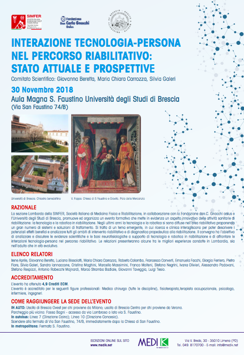 Il rapporto tra tecnologia e persona nel corso di una riabilitazione. È il cuore dell’appuntamento previsto per venerdì 30 novembre nella cornice dell’Aula Magna S. Faustino dell Università degli Studi di Brescia, frutto della collaborazione tra Fondazione Don Gnocchi e SIMFER Società Italiana di Medicina Fisica e Riabilitazione.