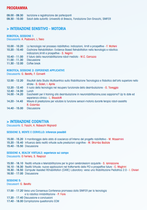 L’evento formativo servirà a mettere in evidenza un aspetto innovativo delle attività sanitarie di riabilitazione: la tecnologia e la robotica. All’appuntamento prenderanno parte sia Maria Chiara Carrozza Direttore Scientifico di Fondazione Don Gnocchi, sia la Dottoressa Silvia Galeri Primario e Direttore del dipartimento di riabilitazione del Centro E. Spalenza Don Gnocchi ONLUS di Rovato e Membro del Consiglio di Presidenza SIMFER. Il tema è sfidante, poiché ricerca e clinica interagiscono per poter descrivere i potenziali effetti benefici da una parte, e l’analisi di tutti gli ambiti di intervento riabilitativo e di diagnostica propedeutica alla riabilitazione dall’altra. Il convegno ha dunque l’obiettivo di analizzare e discutere le evidenze scientifiche e le basi neurofisiologiche a supporto di tecnologia e robotica nella riabilitazione e di affrontare le interazioni tecnologia-persona nel percorso riabilitativo. Le relazioni presenteranno alcune tra le migliori esperienze condotte in Lombardia. L’appuntamento si distinguerà per la varietà di momenti e tematiche: dall’interazione sensitivo-motoria, con la robotica e le sue esperienze applicative, all’interazione cognitiva, con focus su mente, cervello e realtà virtuale, che si sta rivelando di particolare efficacia per la riabilitazione pediatrica.