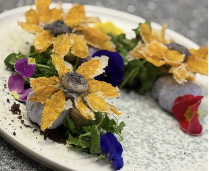 Ingredienti: 3 teste di un girasole piccole; 300 ml olio di semi di girasole; 100 gr semi di girasole; 1 limone; 30 ml olio evo; 100 gr olive taggiasche; 40 gr fiori edibili; 100 gr patate viola; 20 gr burro; 80 gr burro chiarificato; 30 gr semi di sesamo; sale, salvia e rosmarino qb.