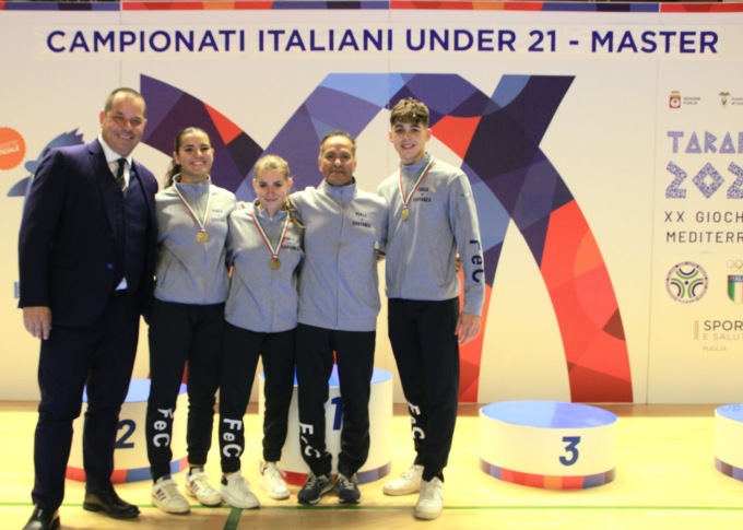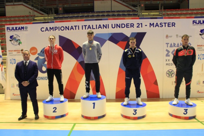Eccezionale prestazione con grandi risultati ai Campionati Italiani U21 di Taranto dove sei giovani del Karate Forza e Costaqnza, presenti tra l’altro con un diciassettenne e due diciottenni, conquistano un Oro e due Bronzo. Gabriele Pezzotti dopo una fase eliminatoria entusiasmante, vince la sua pool dove sono inseriti quasi tutti i migliori della categoria -84 Kg.. Vittorioso nell’ altra pool il Campione della Nazionale U21, Gabriele Rossini, che con il nostro Gabriele sono protagonisti di una finale tiratissima ed emozionante dopo tre minuti di continui scambi di tecniche che solo il VAR con le sue telecamere ha potuto definire in certe situazioni, difficilmente individuabili dall’occhio umano e quindi dagli ufficiali di gara. Vince per due a uno Pezzotti, nonostante lo svantaggio iniziale recuperato e superato con una tecnica di braccia che per la velocità di esecuzione poteva essere vista solo dalla telecamera del VAR. Una vittoria per Gabriele che va a coronare un periodo veramente importante, per un Atleta che dopo l’infortunio al gomito ha potuto superare solo con il sacrificio di duri allenamenti e con la caparbietà di un campione che è potuto ritornare ai vertici che si merita. Valentina Simonini, si aggiudica un terzo posto sul podio nonostante le difficoltà incontrate inizialmente, ma brillantemente superate nei ripescaggi affrontati con determinazione e la solita padronanza sul tatami che con i risultati recentemente ottenuti la collocano al primo posto del Ranking Nazionale nella categoria -68 kg. U21.