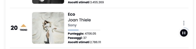 Joan Thiele la cantautrice italo colombiana di Desenzano del Garda è invece al 20esimo posto con la sua “Eco”.