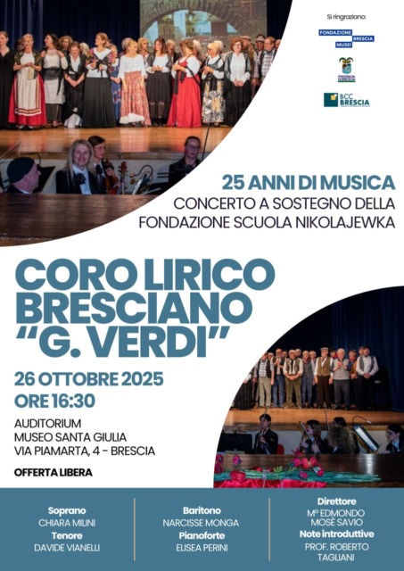 Domenica 26 ottobre 2025, alle ore 16.30, l’Auditorium del Museo di Santa Giulia (via Piamarta 4, Brescia) ospiterà un evento musicale di grande rilievo: il concerto del Coro Lirico Bresciano “Giuseppe Verdi”, che festeggia i 25 anni di attività. L’iniziativa, organizzata con il sostegno della Fondazione Scuola Nikolajewka, avrà finalità benefiche e sarà a ingresso libero con offerta volontaria.
