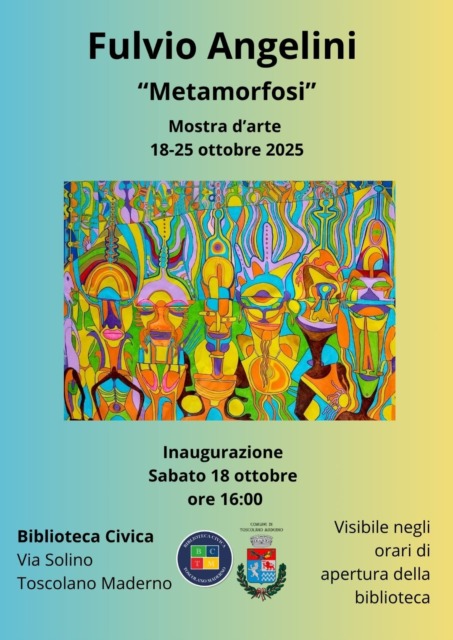 «Metamorfosi», questo il titolo della mostra d’arte che sarà ospitata da sabato 18 a sabato 25 ottobre nei locali della biblioteca Civica di via Solino. L’inaugurazione sabato 18 ottobre alle 16. Al centro le opere di Fulvio Angelini , pittore, sculture e navigatore. Angelini nasce e vive tra il lago di Garda e il Mediterraneo, in un rapporto di fruttuoso interscambio con la terra e l’acqua.