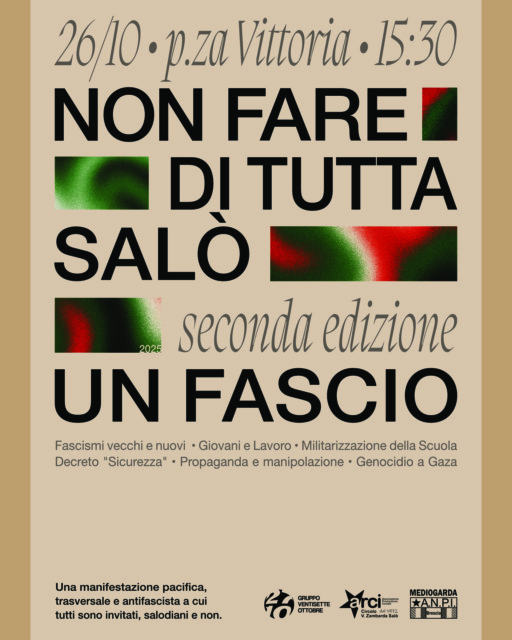 Domenica 26 ottobre 2025 alle 15.30 in Piazza Vittoria l’evento “Non fare di tutta Salò un fascio” giunto alla seconda edizione. Al centro: Fascismi vecchi e nuovi, giovani e lavoro, militarizzazione della scuola, Decreto Sicurezza, propaganda e militarizzazione e genocidio a Gaza.