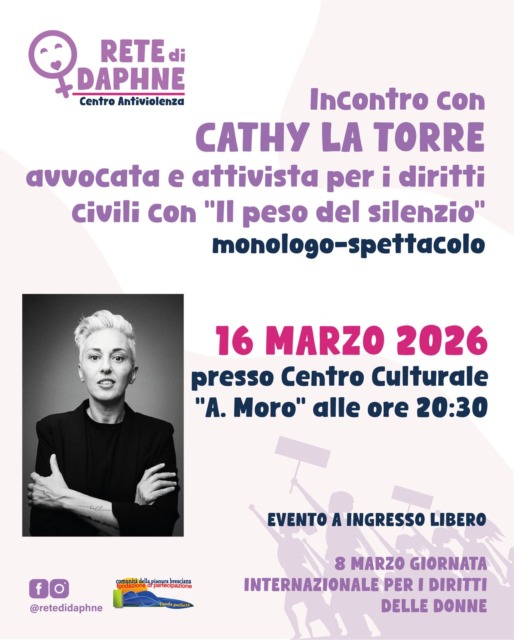 A seguire lunedì 16 marzo 2026 alle 20.30 sempre al Centro Culturale Aldo Morosi terrà l’incontro con Cathy La Torre avvocata attivista per i diritti civili con “Il peso del silenzio”.