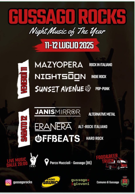 Due serate all’insegna del rock, dell’energia e della condivisione, che vedranno alternarsi sul palco Mazyopera, Nightsoon, Sunset Avenue, Janismirror, EraNera e Offbeats: sei band pronte a trasmettere emozioni e coinvolgere un pubblico trasversale attraverso le loro performance live.
