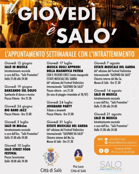 “Una delle caratteristiche della stagione estiva sul Garda Bresciano sono le serate in riva al lago, tra amici, con un drink e la musica dal vivo. Bene, allora segnatevi queste date: 12 giugno, 3 luglio, 14 agosto e 21 agosto” ha dichiarato Andrea Maggioni Presidente di Salò ProMotion – . Sarà impossibile non muovere le gambe per due passi di danza o accennare con le labbra una canzone. Alcuni negozi saranno aperti sino alle ore 23.00 così da consentire lo shopping serale in quella che è senza ombra di dubbio la capitale commerciale della sponda Bresciana del Lago di Garda. Non un evento ma ben 4 eventi che racchiudono una intera estate Salodiana”.